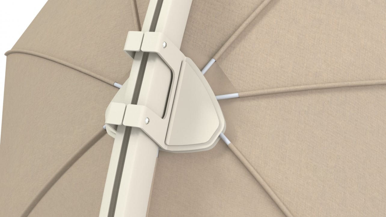 Its canopy is reinforced with Glass Fiber ribs and covered in premium Sunbrella® fabric measuring 9' 10” in Sand color and features a Beige Limestone (RAL 1013) frame with round support. Its 360° rotational base and stainless steel handle allow for easy adjustment as the sun moves.