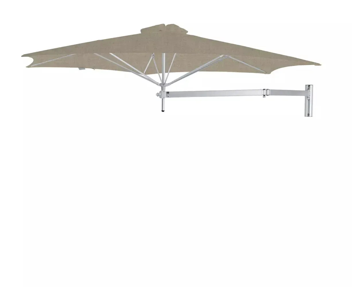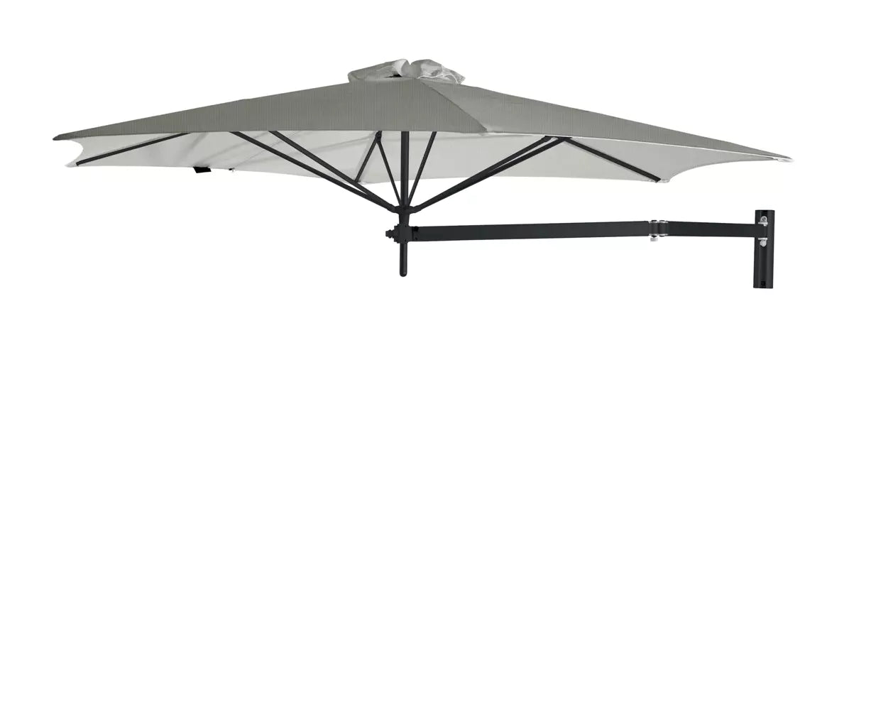 The Umbrosa Paraflex Wall Mounted Umbrella (Round) provides optimal shade coverage without the need for a base or central pole. This outdoor umbrella, available in two sizes (8ft 10" and 9ft 10"), features a compact and flexible design, perfect for patios, balconies, and smaller outdoor areas with limited floor space.