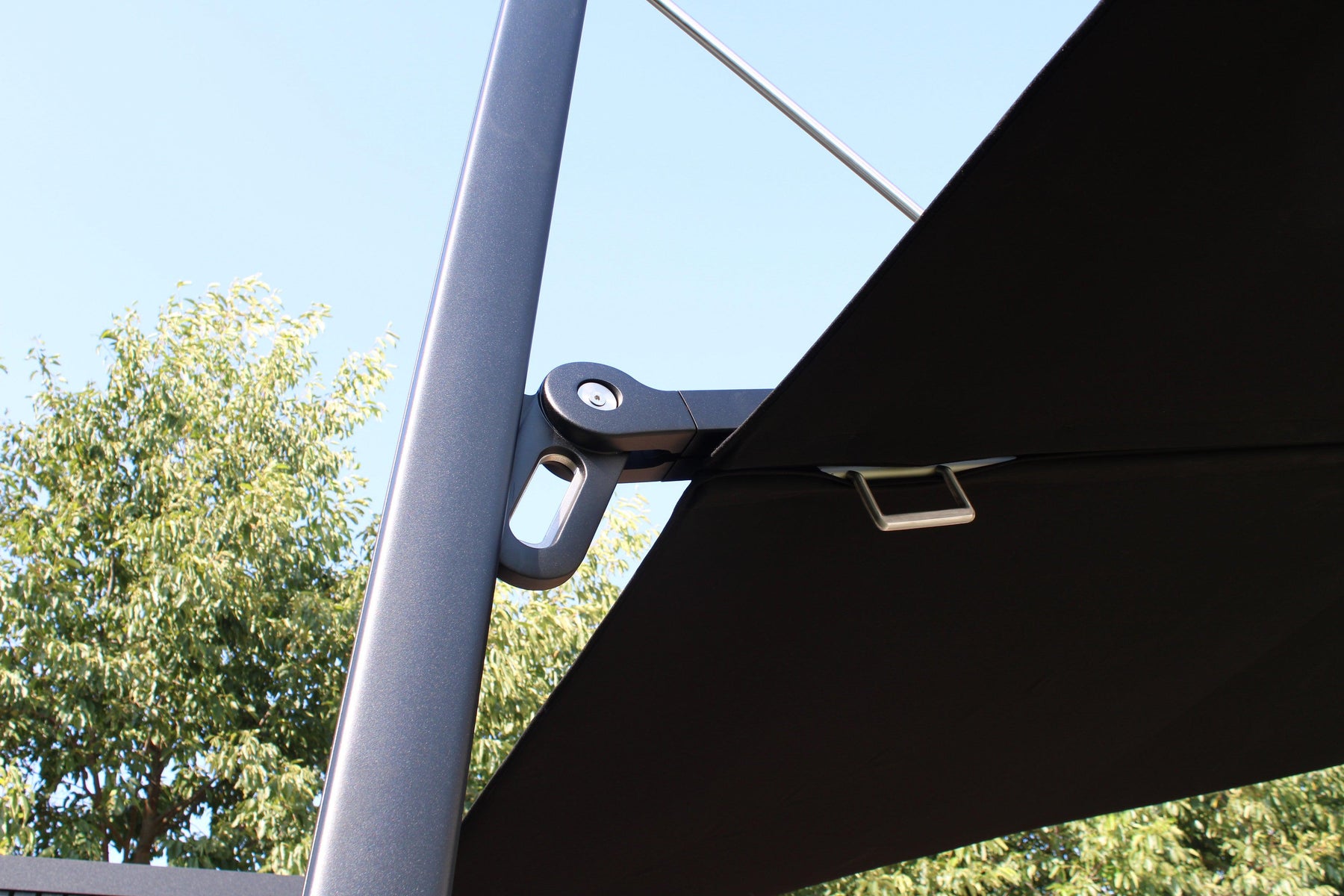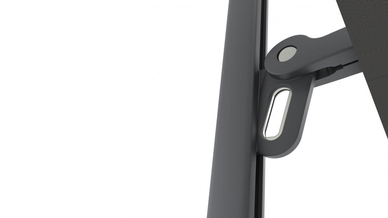 The ergonomic design includes a forward-leaning 80° pole. This creates additional space between the table and the base. The height-adjustable handle grip mechanism allows users to easily modify the canopy's position. This offers flexibility to suit different sun angles and seating arrangements.