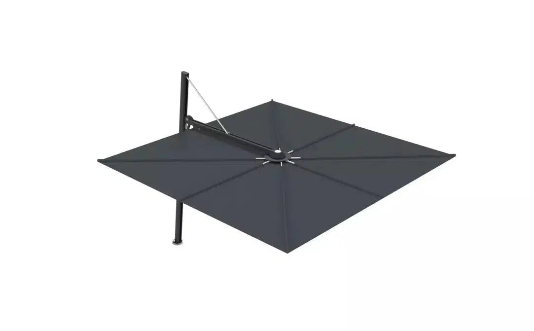 The Umbrosa Versa PX Full Black Square Umbrella offers a sophisticated shade solution perfect for smaller terraces or upscale commercial properties. With its minimalist yet striking design, this cantilever umbrella features a 9'10" x 9'10" square canopy in a black color, supported by a powder-coated frame in RAL 905 (Full Black). It features an 80° forward tilting side pole, 360° rotation, and adjustable tilt so that you can utilize space optimally and ensure maximum comfort.
