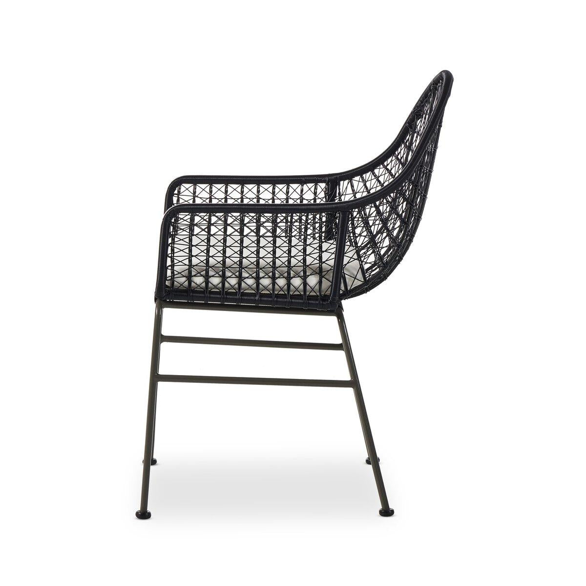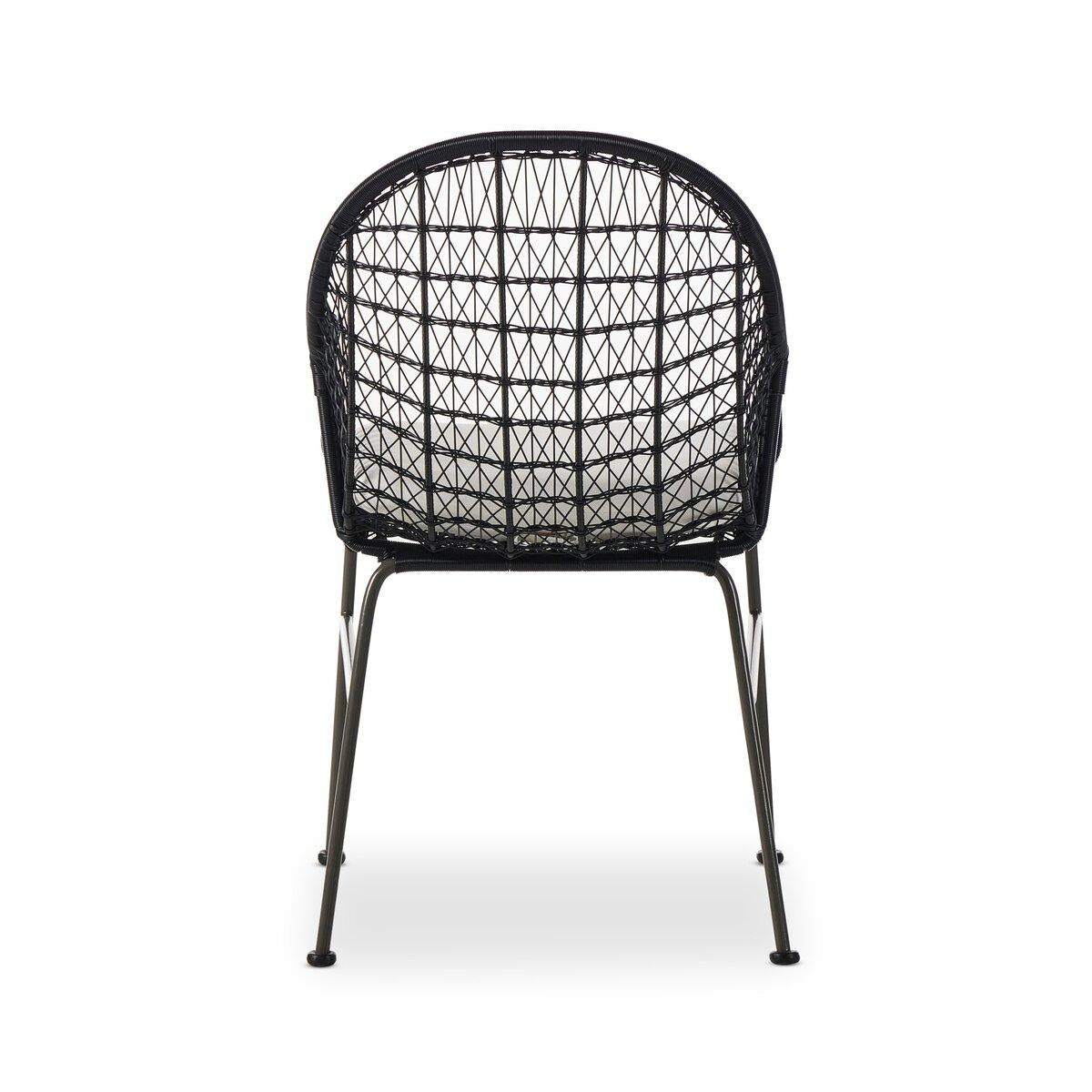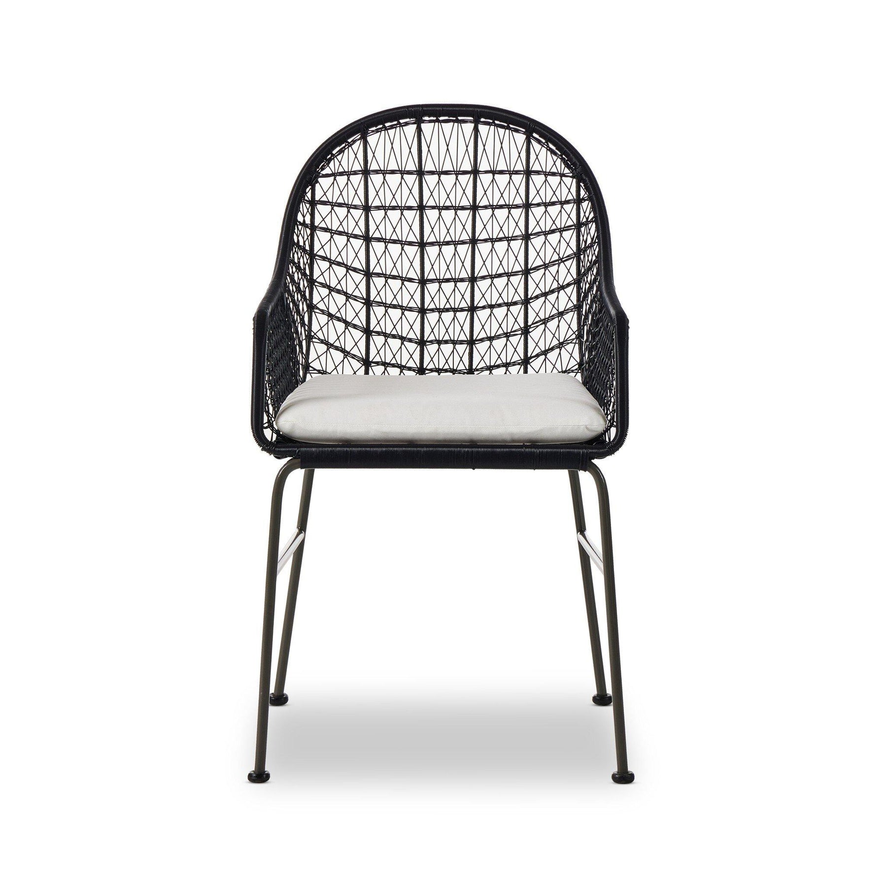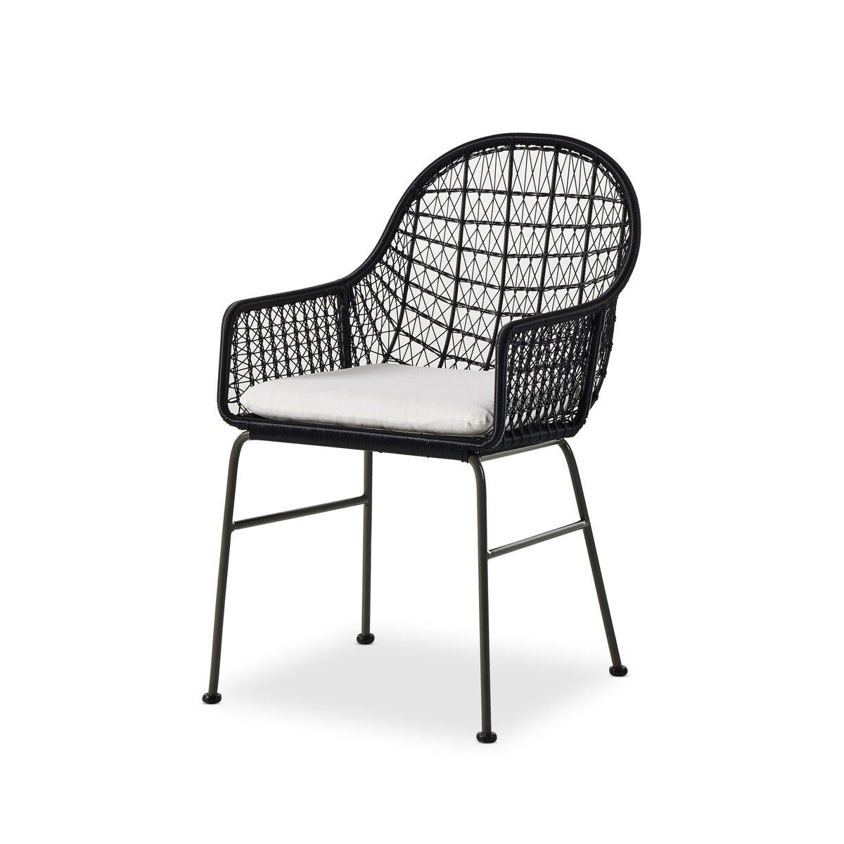 Clean, contemporary shaping and an updated weave transform all-weather wicker into something modern. This high-texture dining chair is supported by a contrasting bronzed or black iron base, with a white seat cushion for comfort.