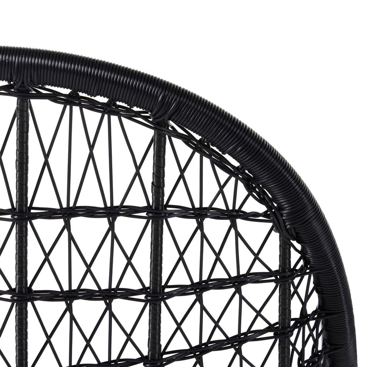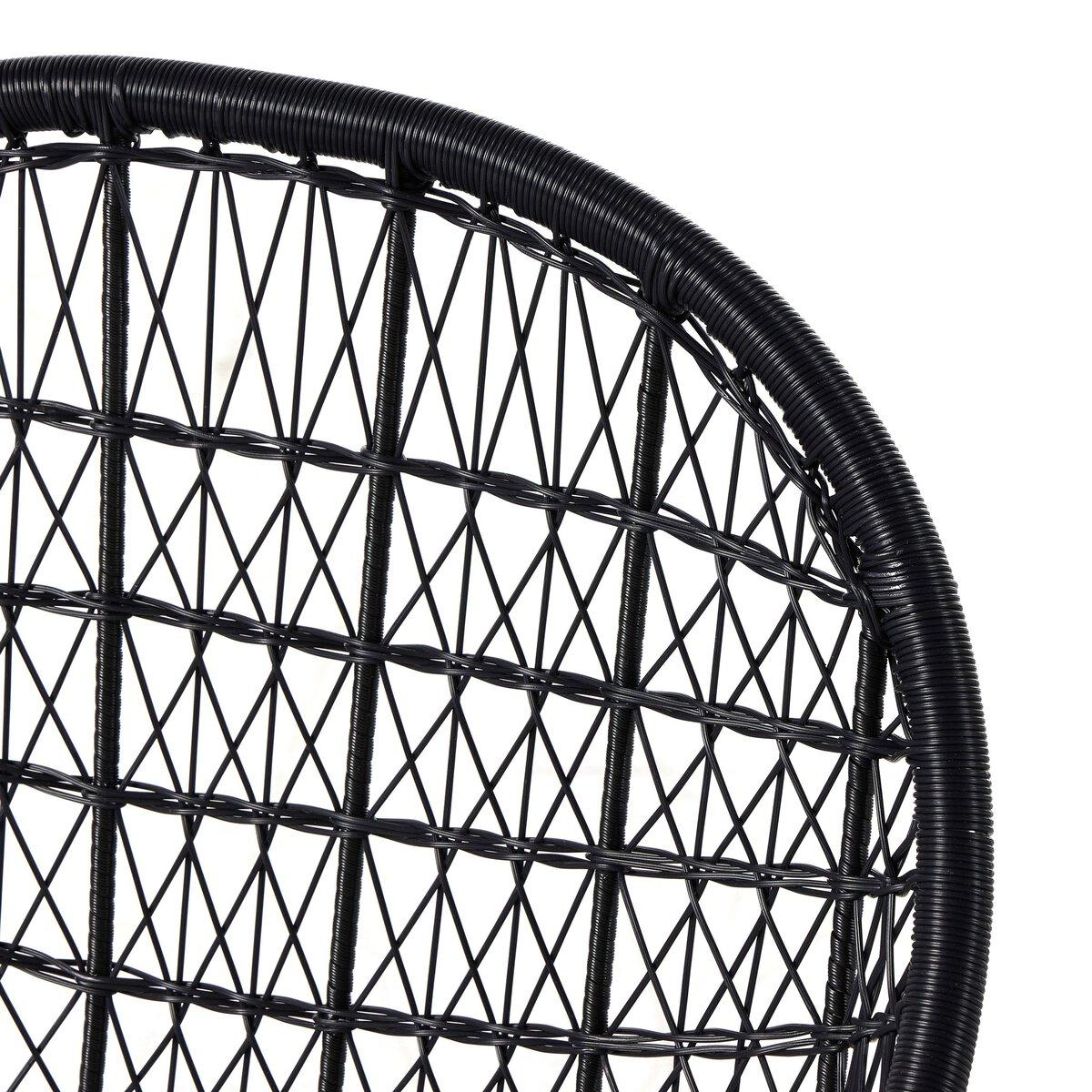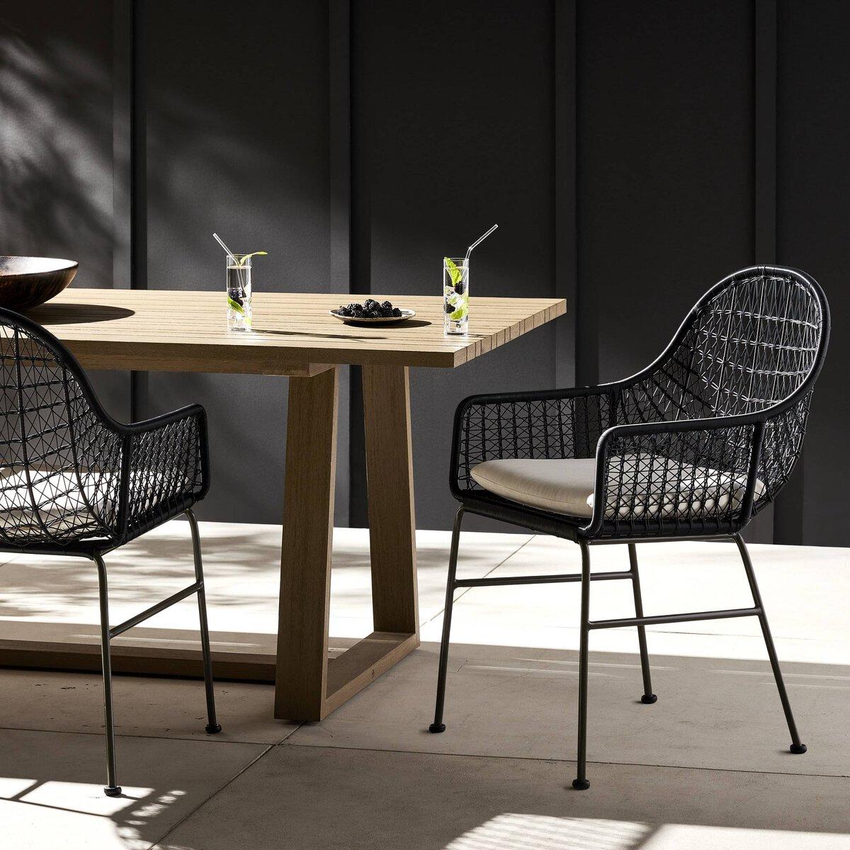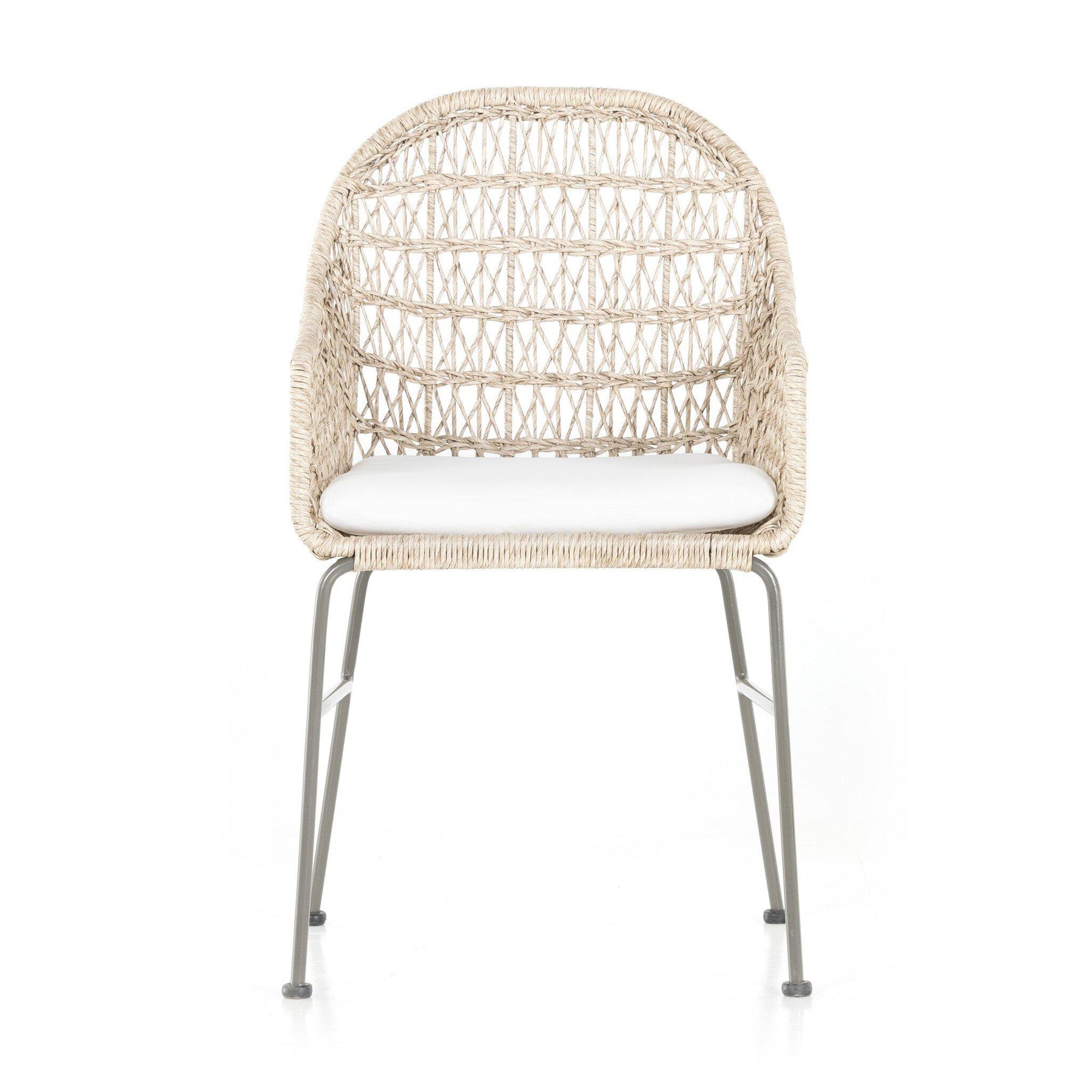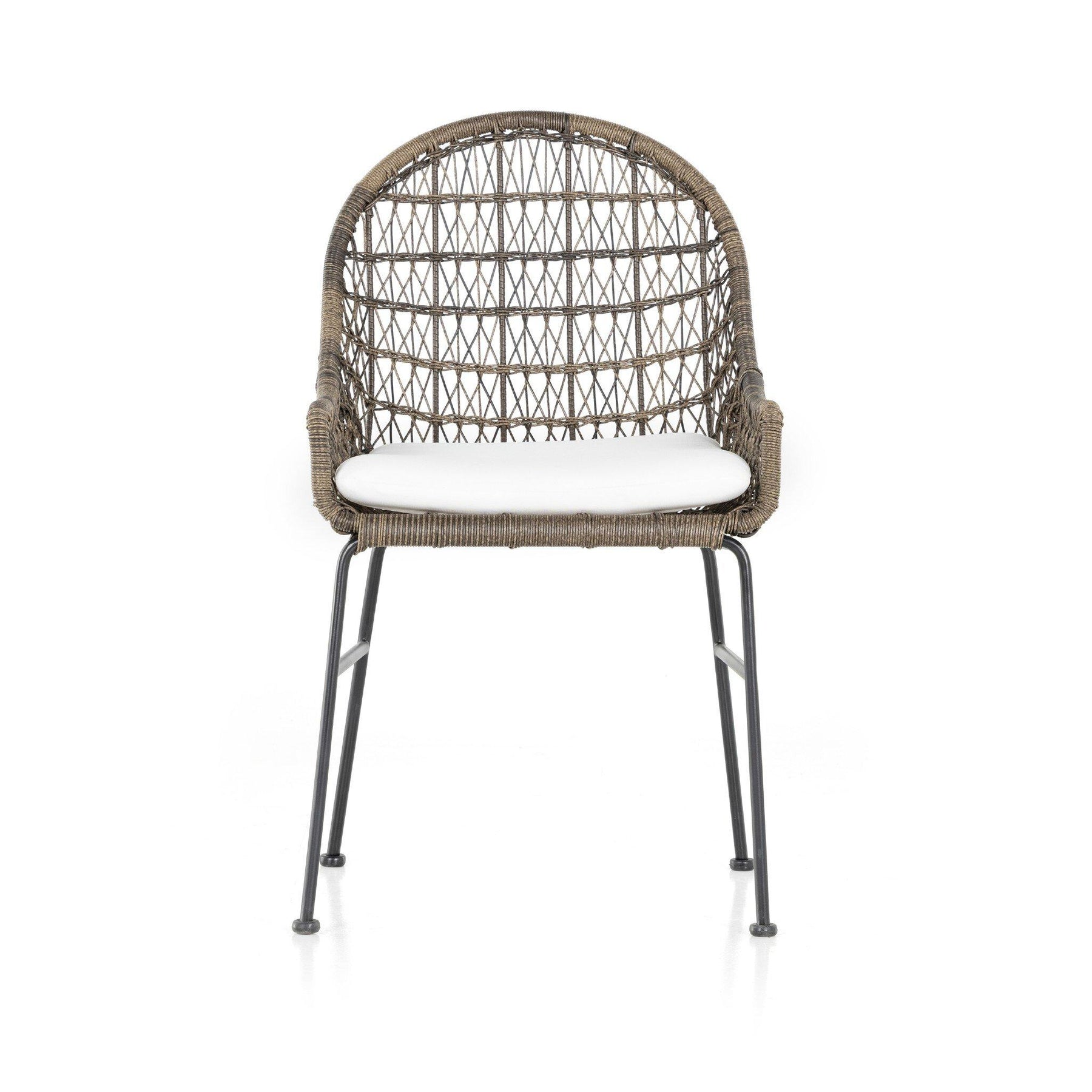 Clean, contemporary shaping and an updated weave transform all-weather wicker into something modern. This high-texture dining chair is supported by a contrasting bronzed or black iron base, with a white seat cushion for comfort.