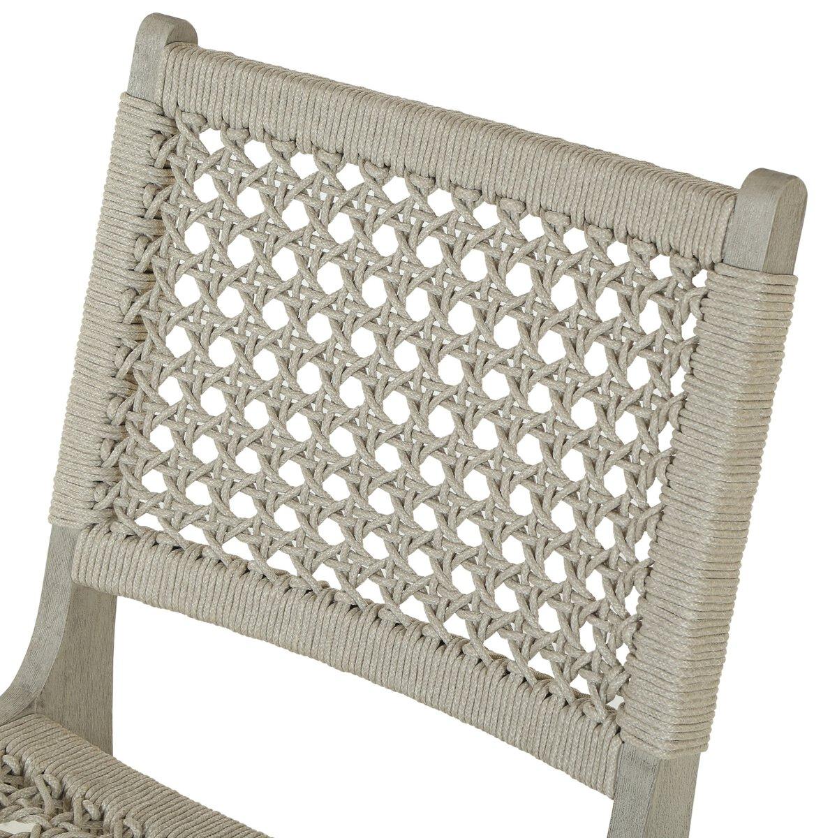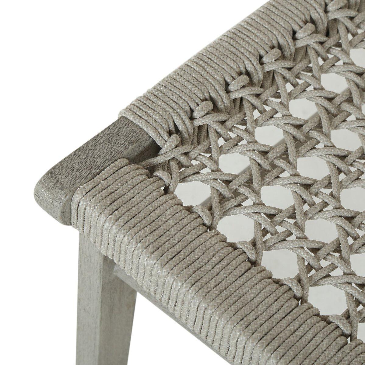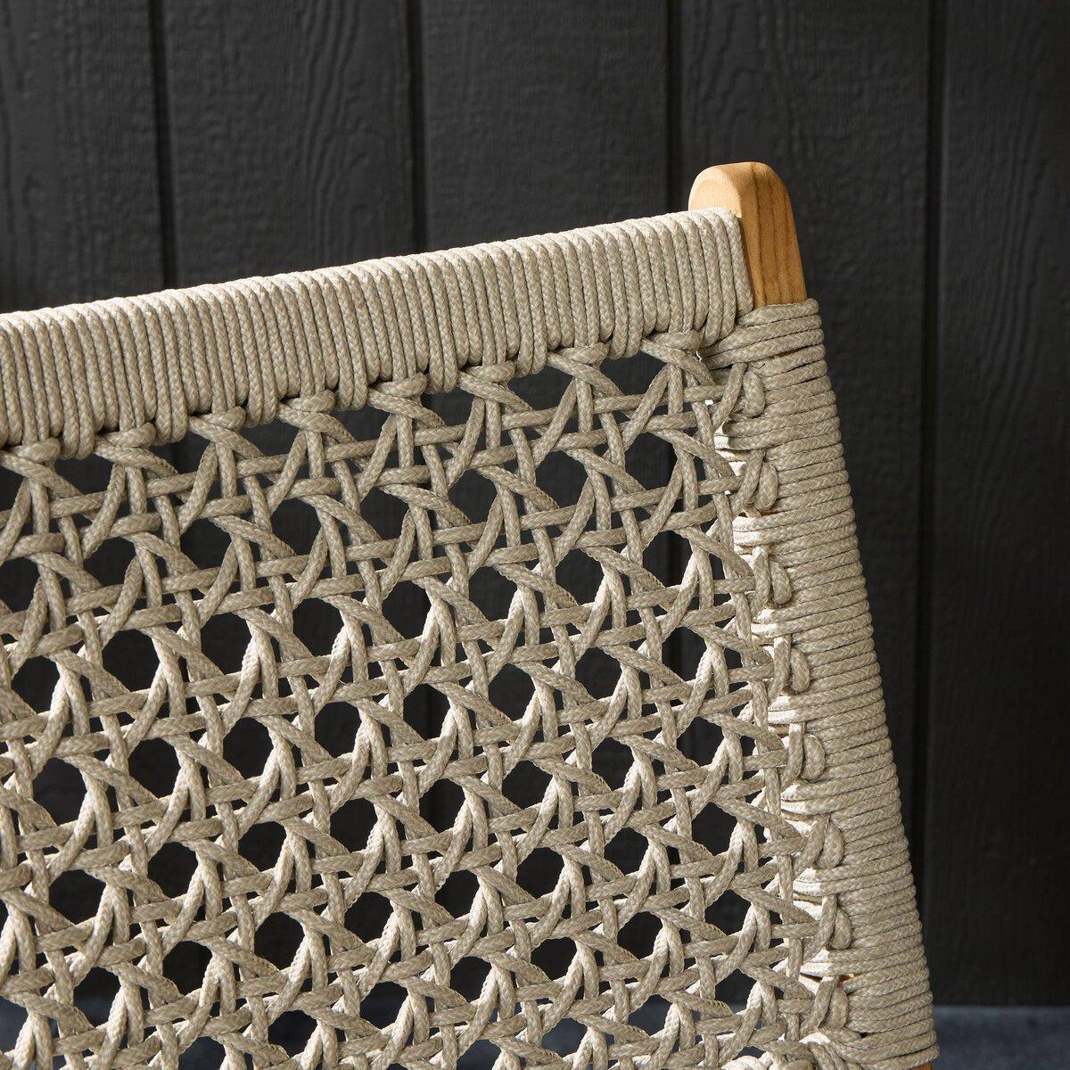 Simply stylish, indoors or out. Weathered grey, washed brown, or natural FSC-certified teak frames woven ivory rope, making a texture-driven statement. Cover or store inside during inclement weather and when not in use.