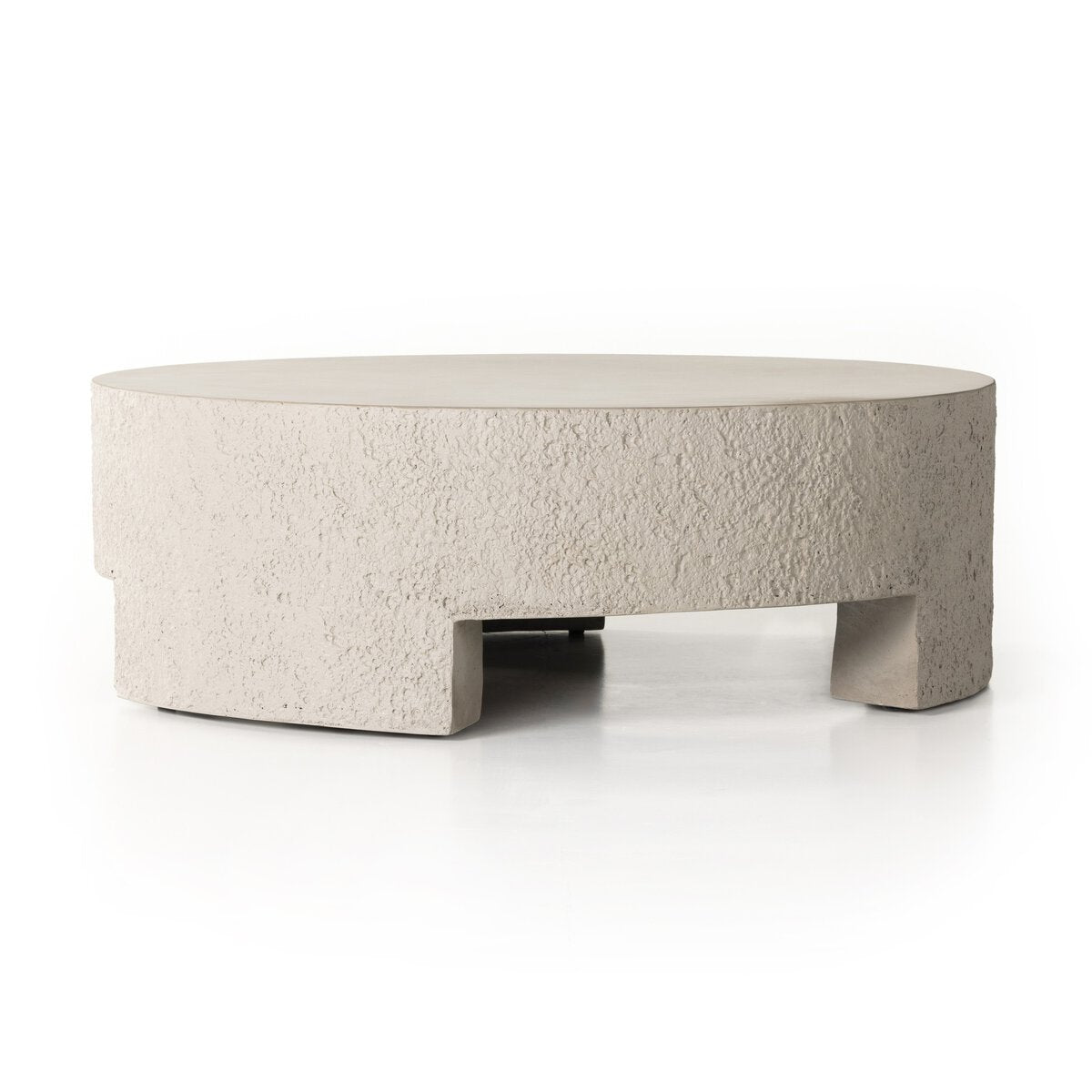 The Kember Outdoor Coffee Table blends heavy texture with refined simplicity. Crafted from solid pumice concrete, its smooth top contrasts with a bold cylindrical base lifted by cutout legs. This balance of mass and openness makes it a striking centerpiece for any outdoor or indoor living space.