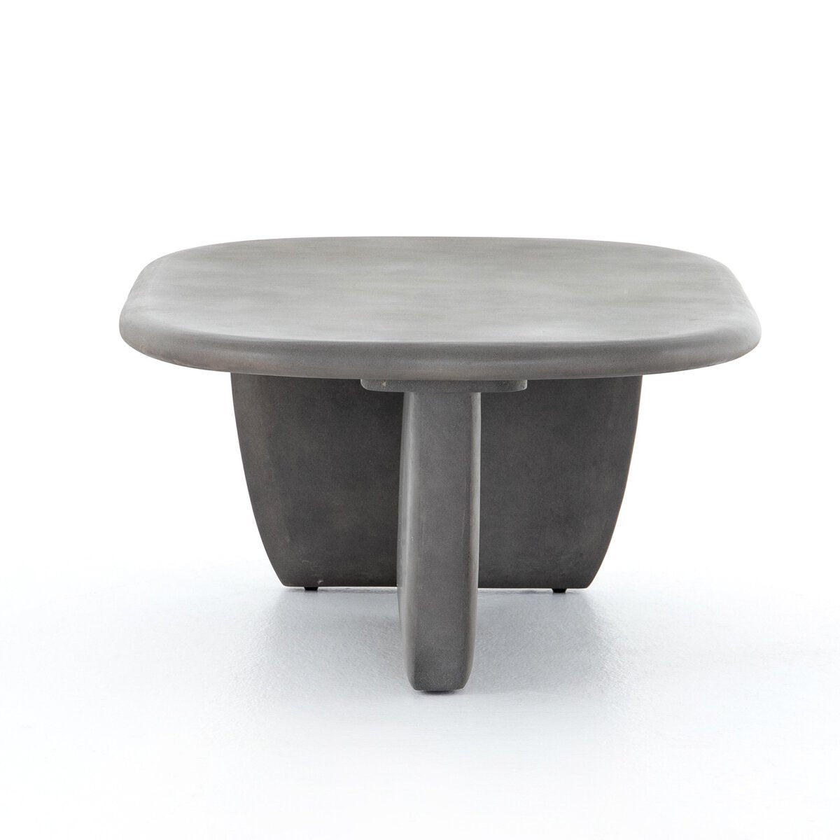The Naya Outdoor Coffee Table introduces sculptural curves to outdoor lounging. Crafted from solid dark grey concrete, the table features a rounded rectangular top with bullnose edging, reminiscent of a refined surfboard form. Perpendicular slab bases add architectural depth, bringing balance and intrigue to patios, decks, or indoor spaces.