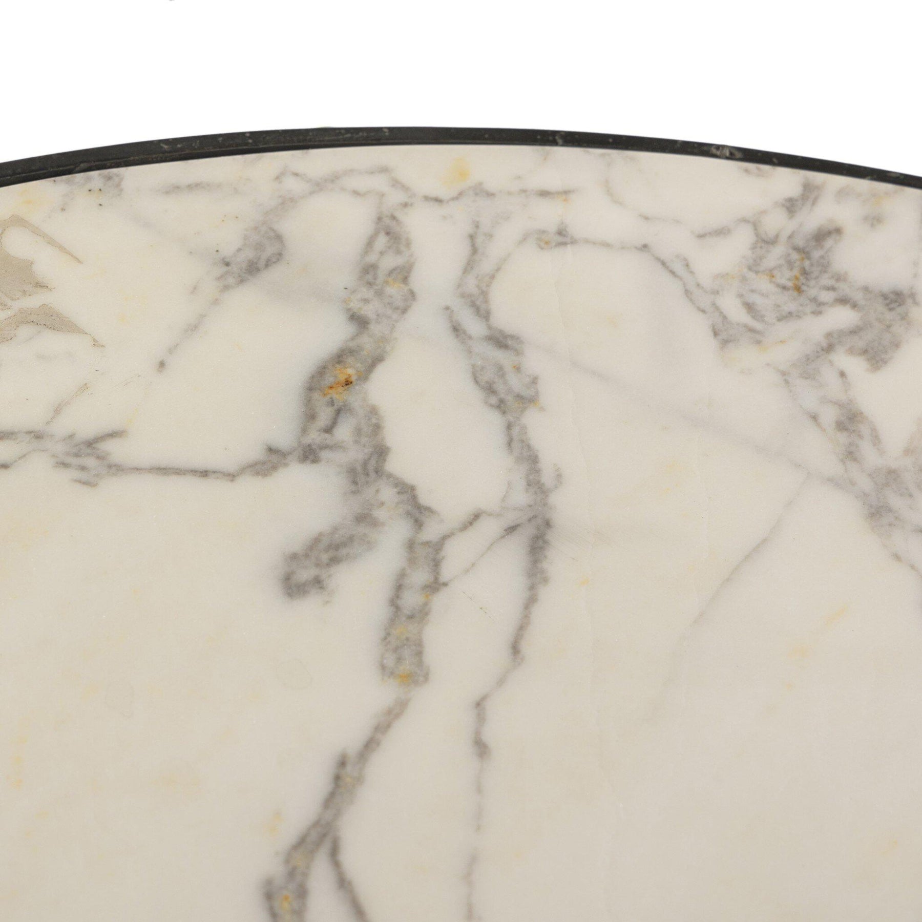 A tulip base of grey-finished aluminum supports a rounded inset tabletop of white marble, with beautiful natural veining to finish this outdoor dining table. Cover or store indoors during inclement weather and when not in use.