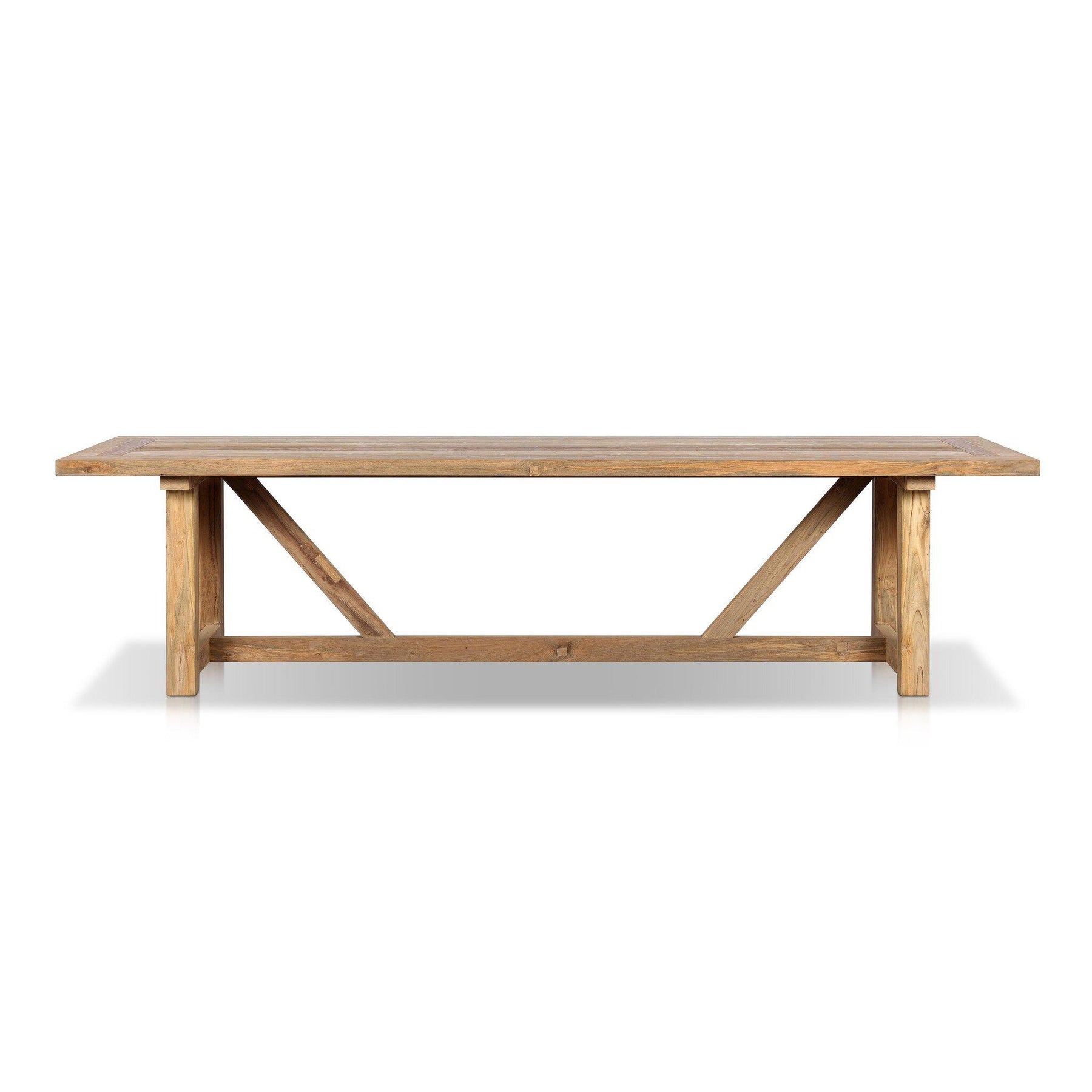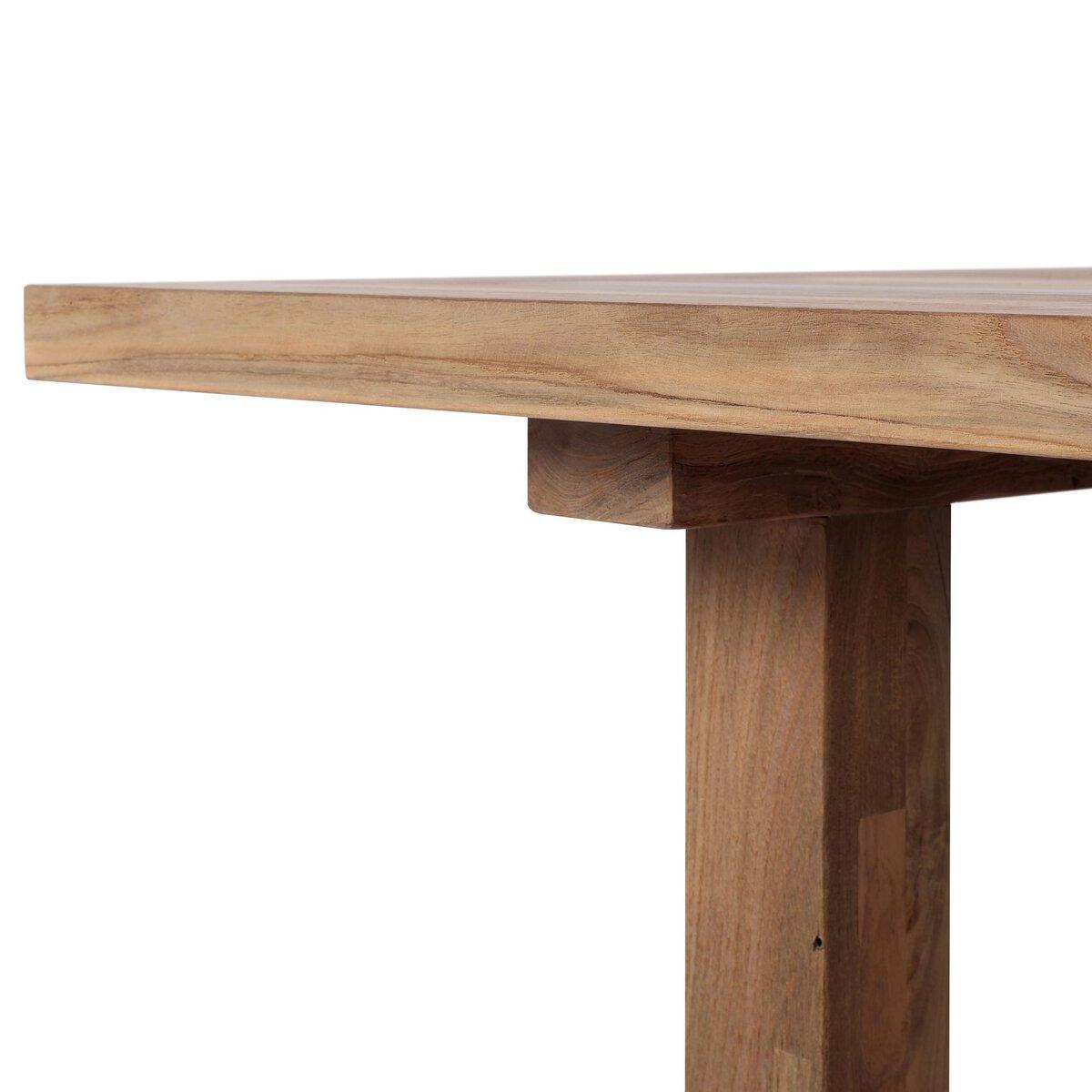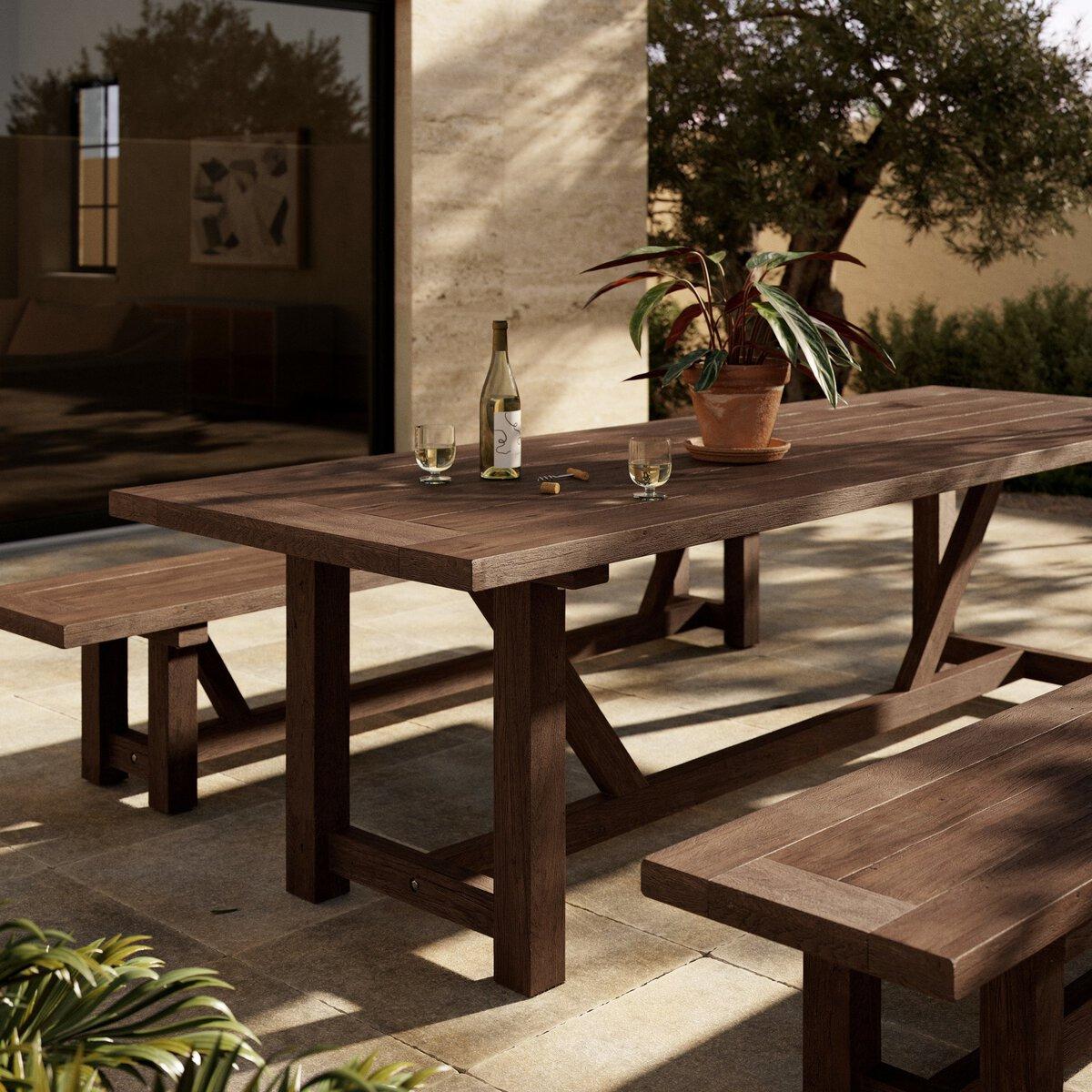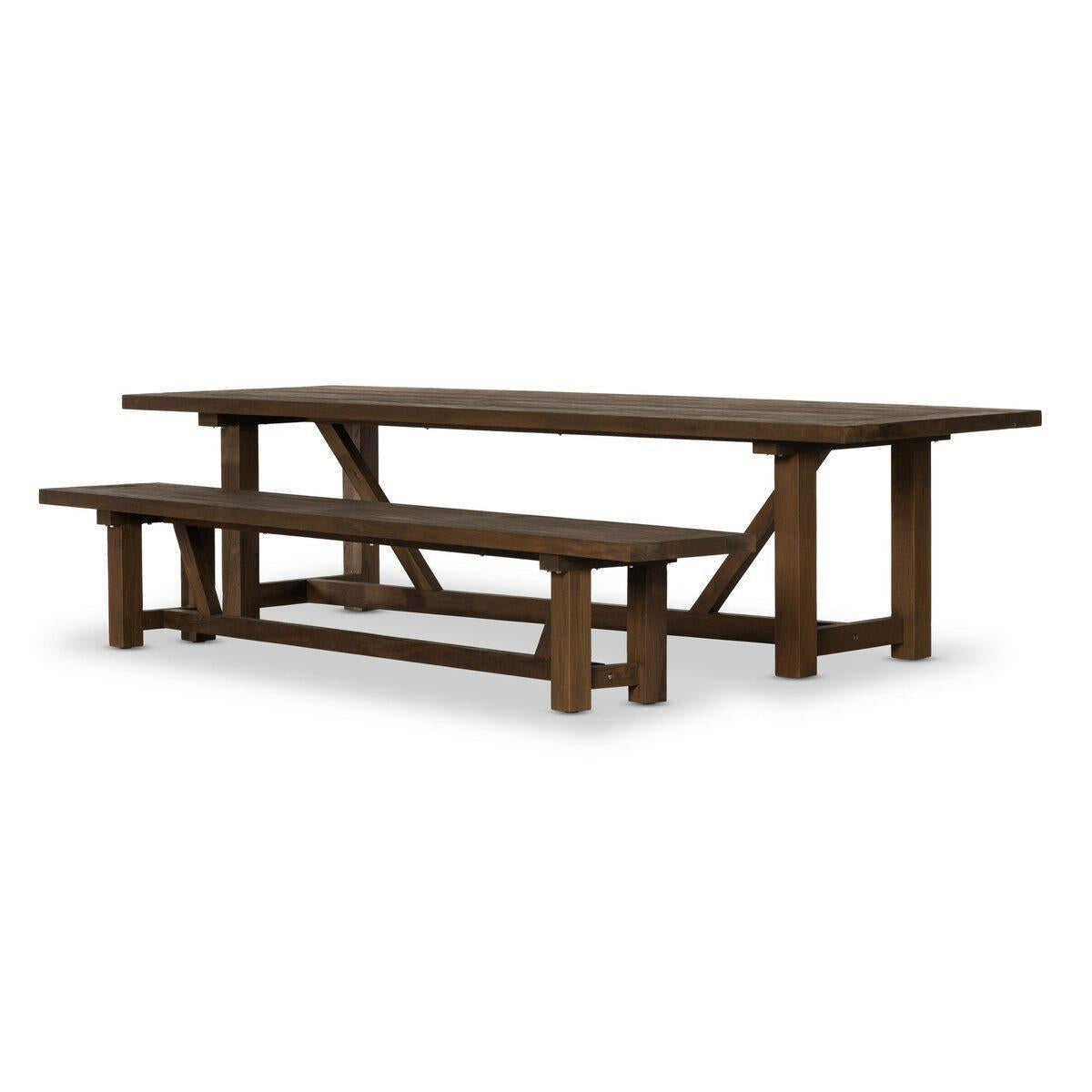Clean lines, sustainable style. Made from FSC®-certified reclaimed teak, this trestle-style table features natural knots, graining and patching, reflective of the material's sourcing. Seats 12 comfortably. Cover or store indoors during inclement weather and when not in use.