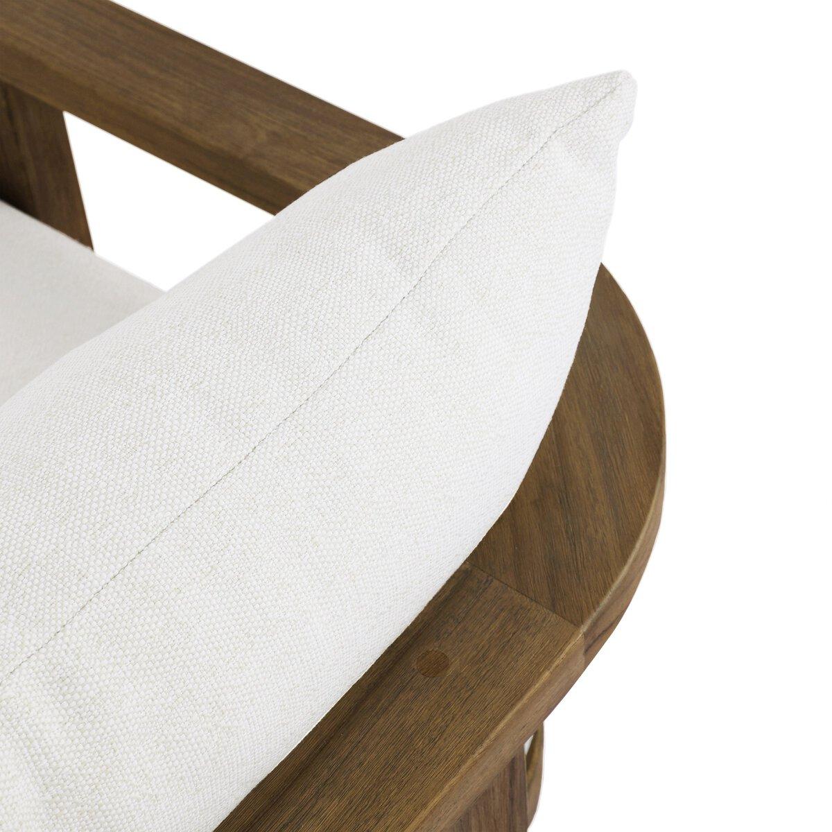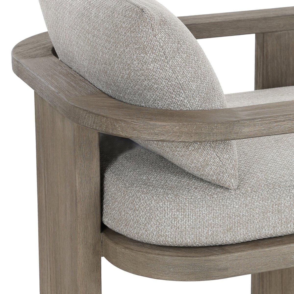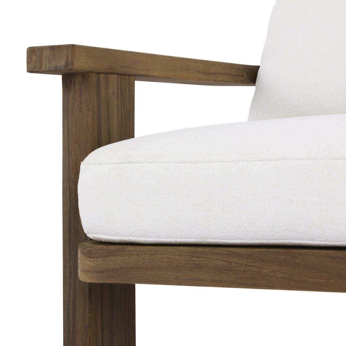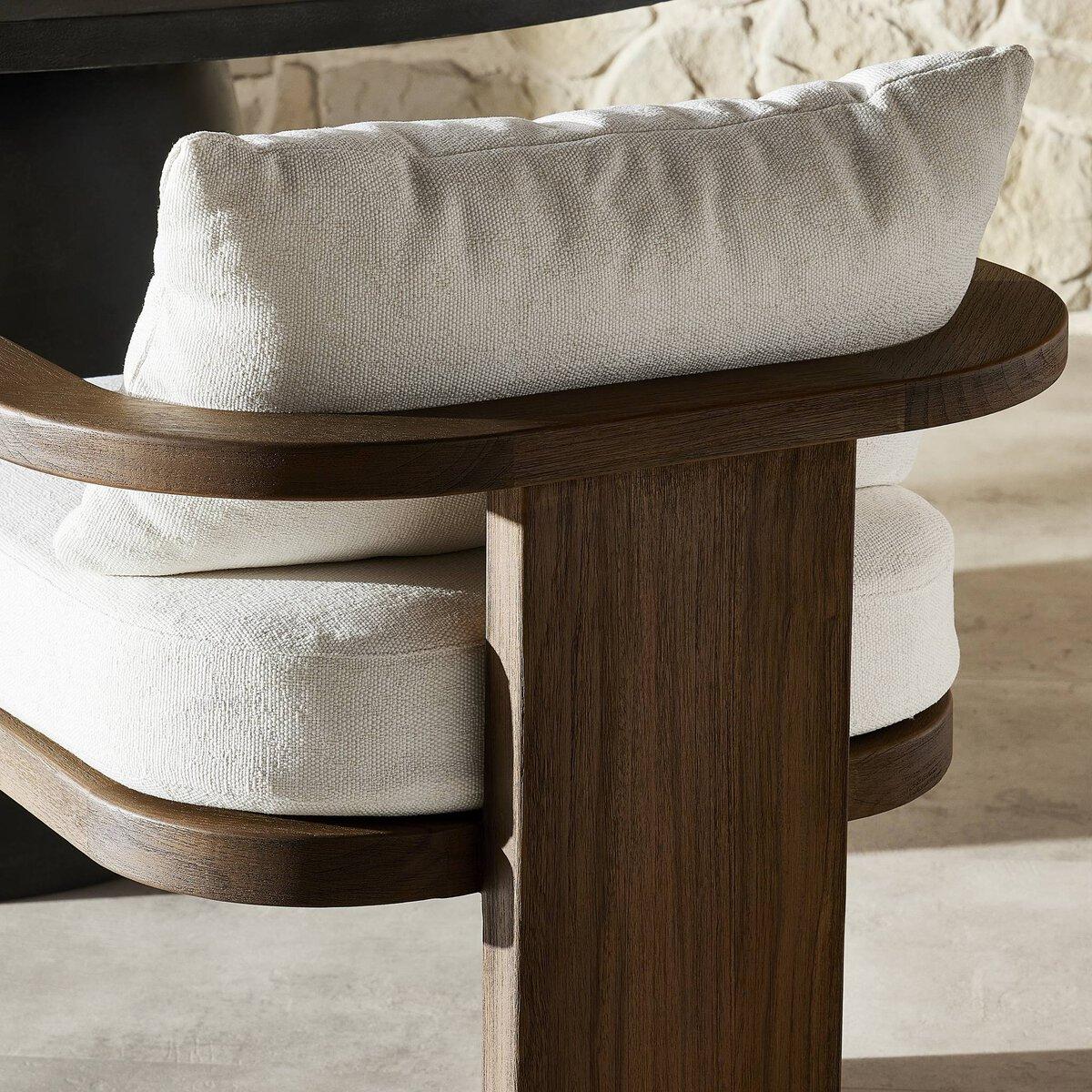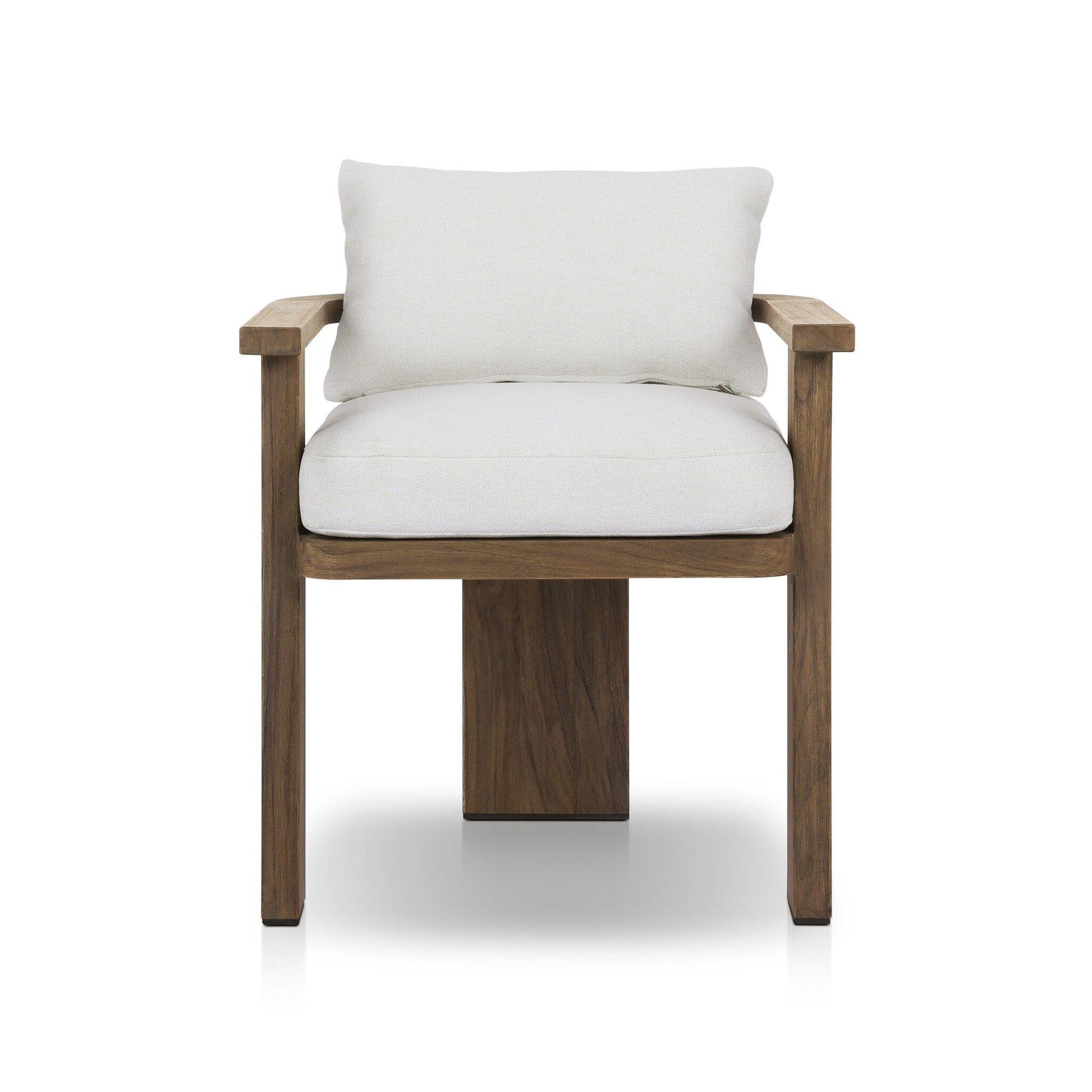 Clean and simple, this bold outdoor dining armchair features a distinctive three-leg design and curved seat back, crafted from FSC®-certified wood. The thick box cushion and knife-edge back cushion are finished in a high performance Italian upholstery. Cover or store indoors during inclement weather and when not in use.
