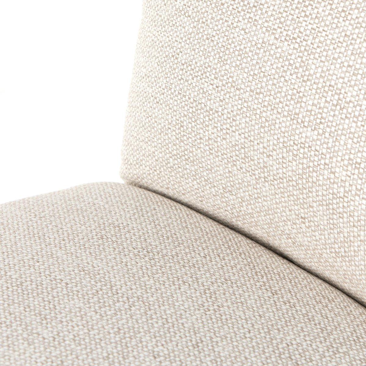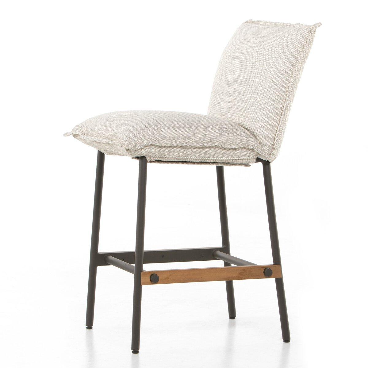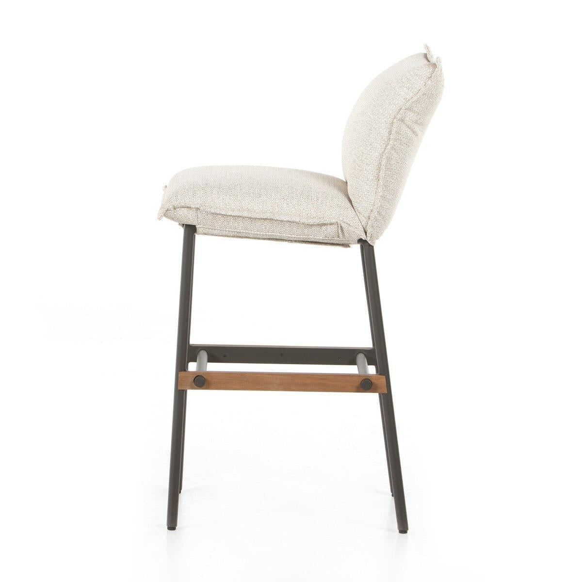 A plush take on outdoor entertaining. Durable ash- or sand-colored upholstery features flange detailing, for a luxuriously comfy sit with fresh flair. An airy, dark bronze-finished iron base with teak-detailed stretchers mixes materials to beautifully modern effect. Cover or store indoors during inclement weather and when not in use.