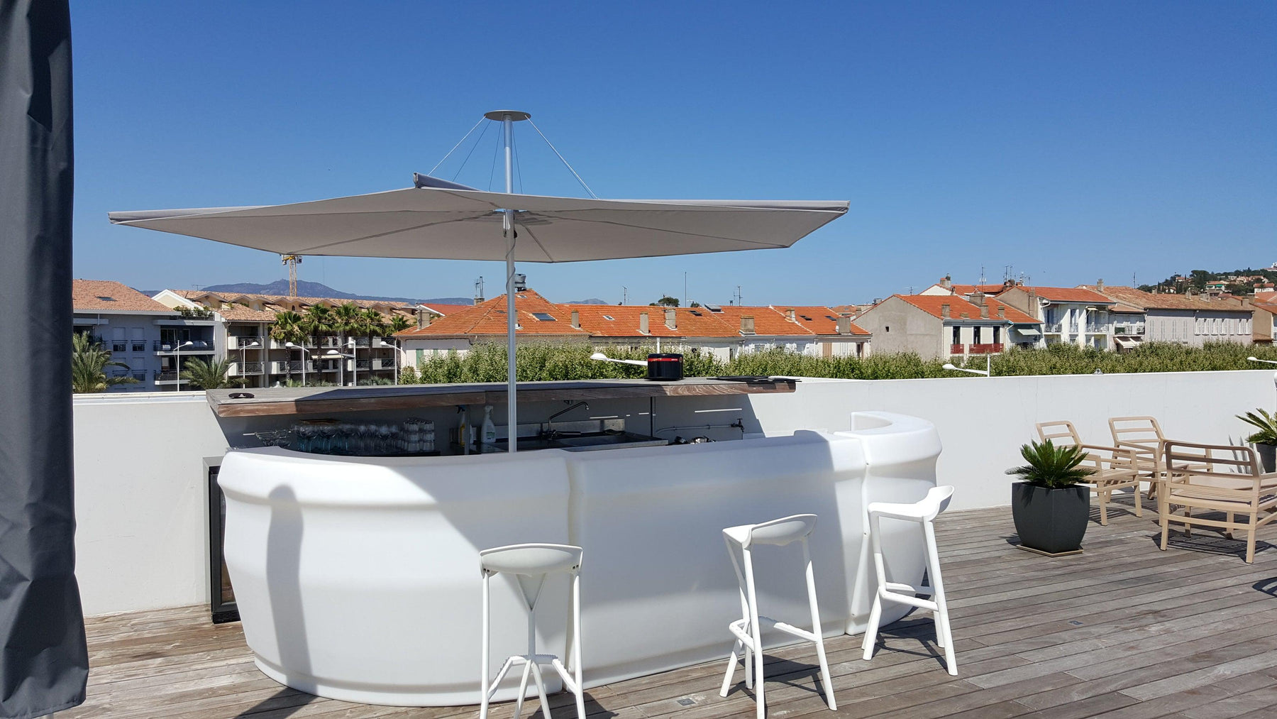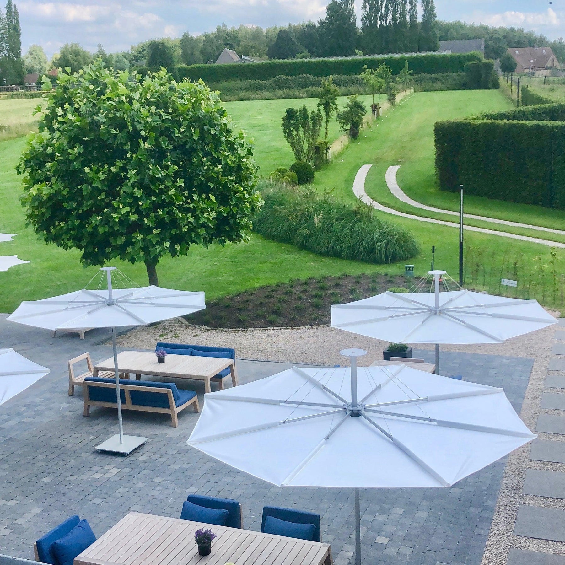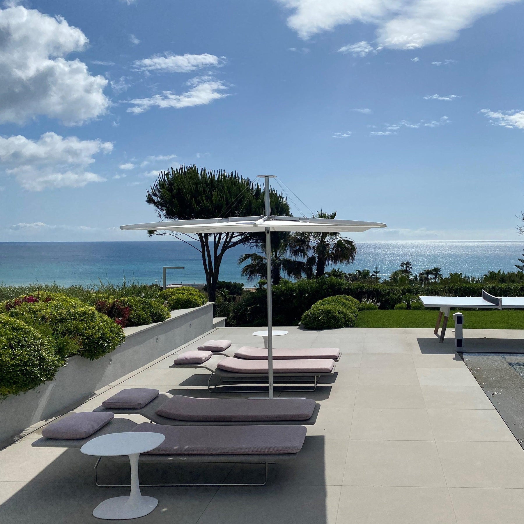 Umbrosa reimagines the traditional parasol archetype by refining every detail. The Infina’s flat canopy and sculptural profile introduce modern softness while maintaining a highly functional structure.