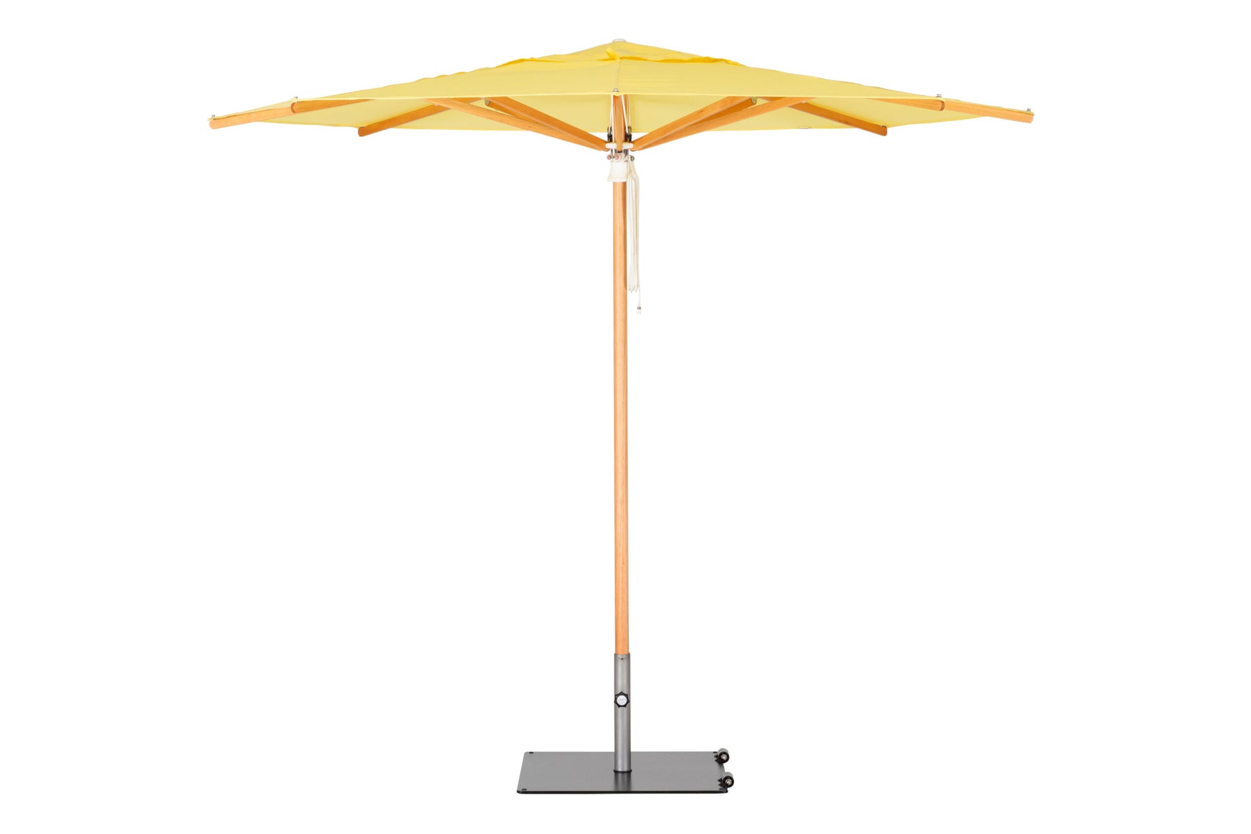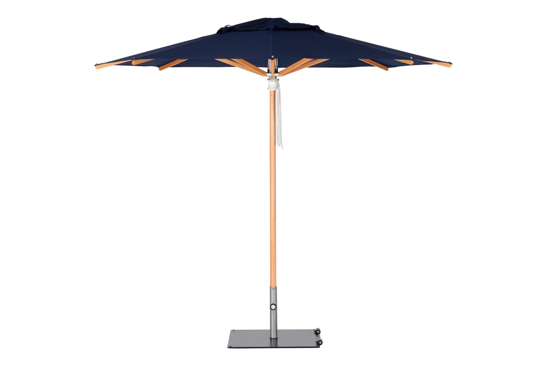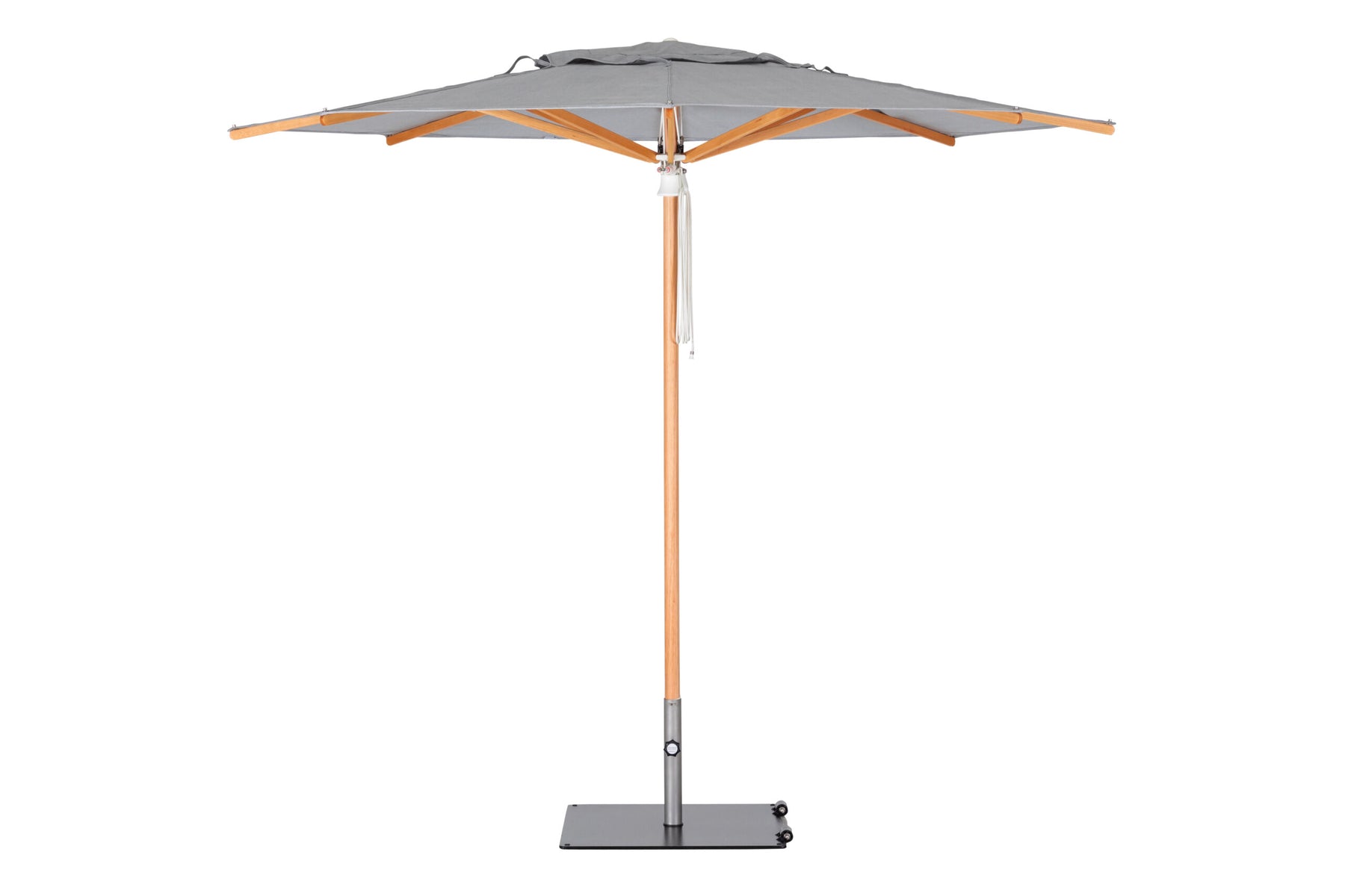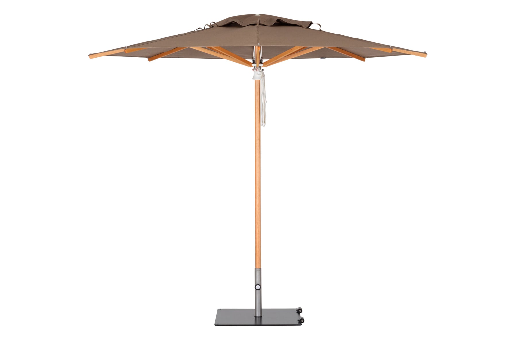 A refined center-post parasol available in aluminium or hardwood.