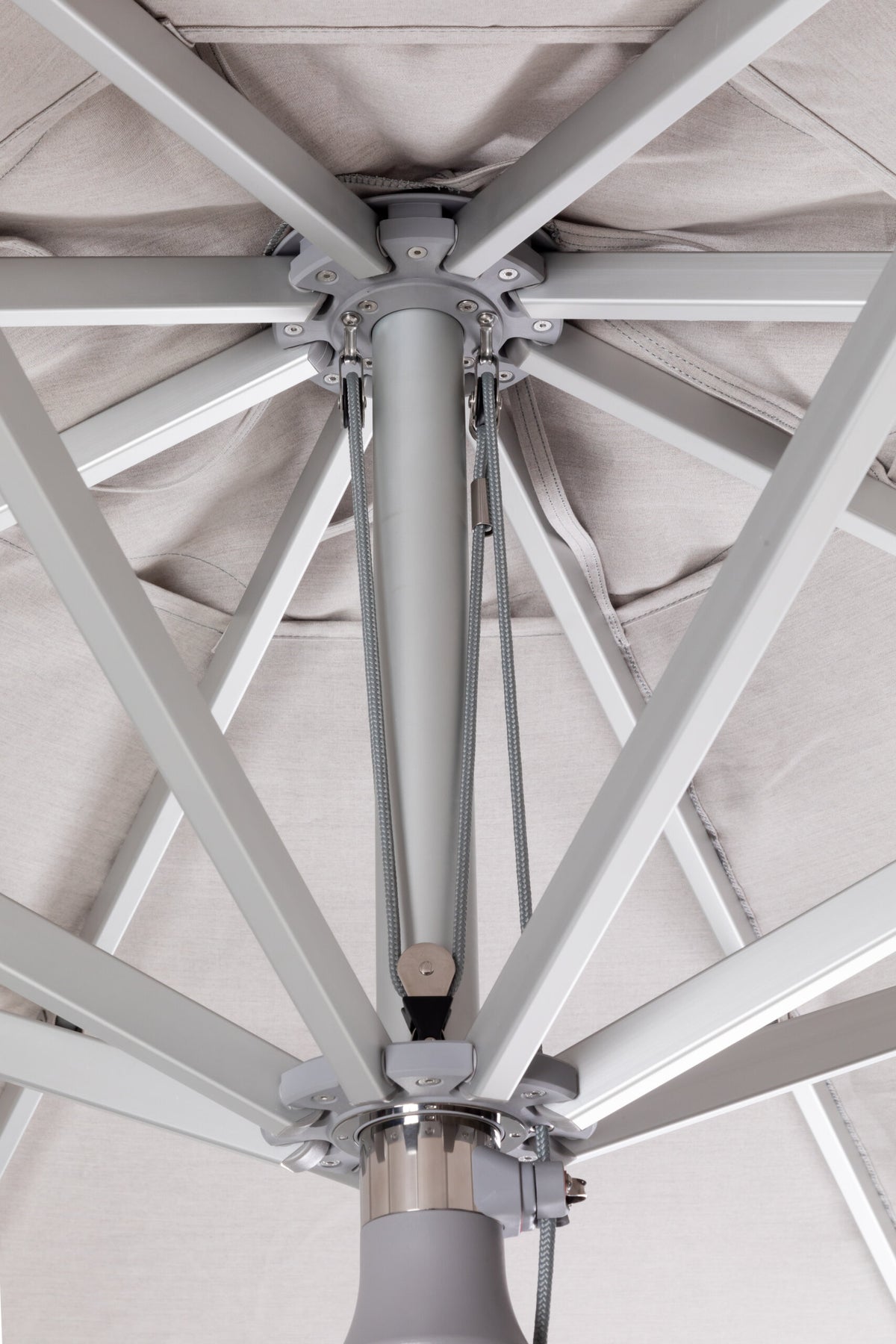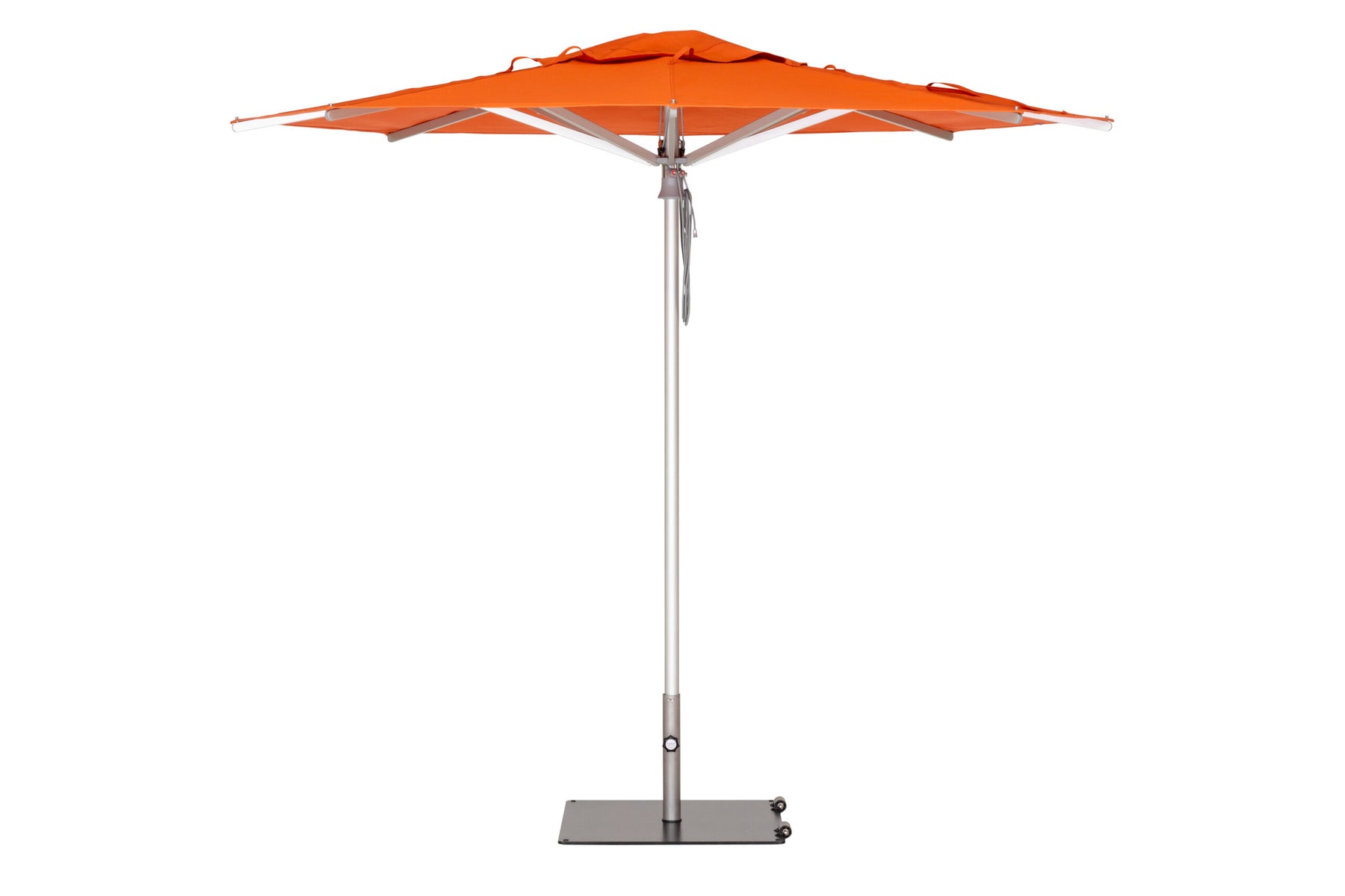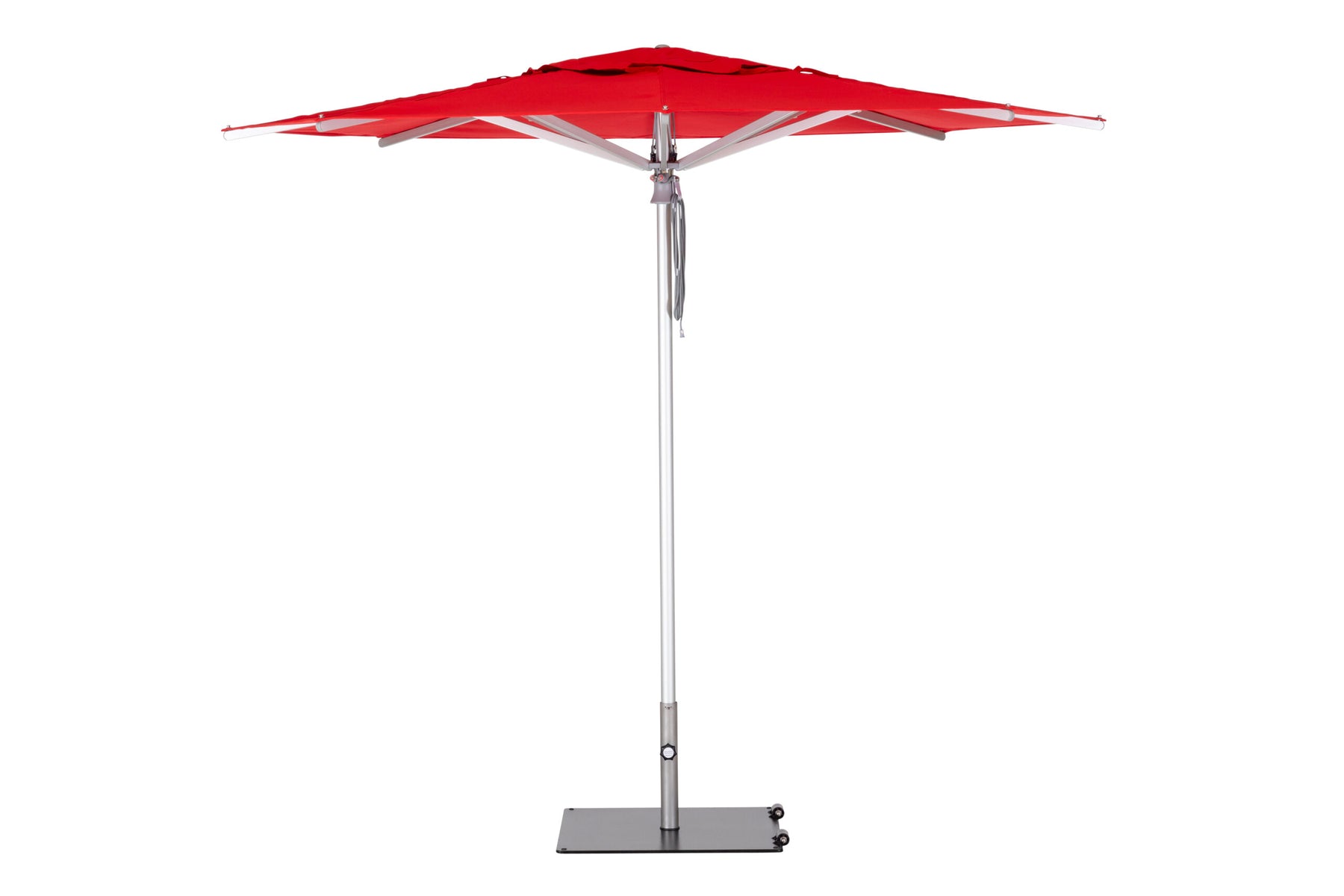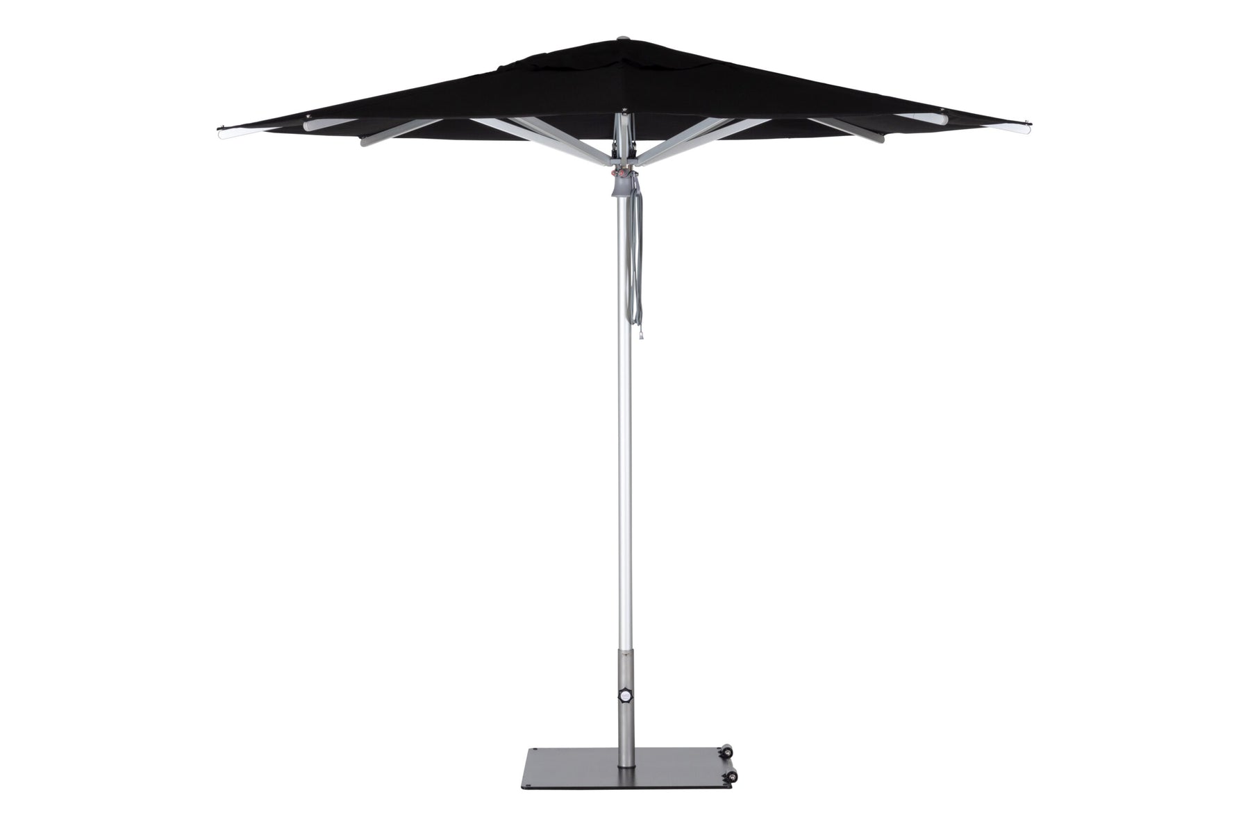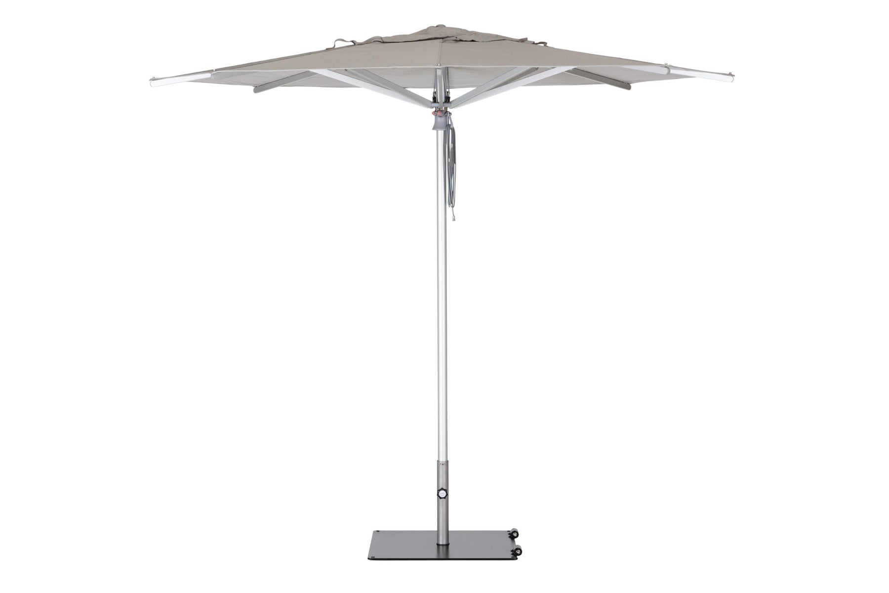 A refined center-post parasol available in aluminium or hardwood.
