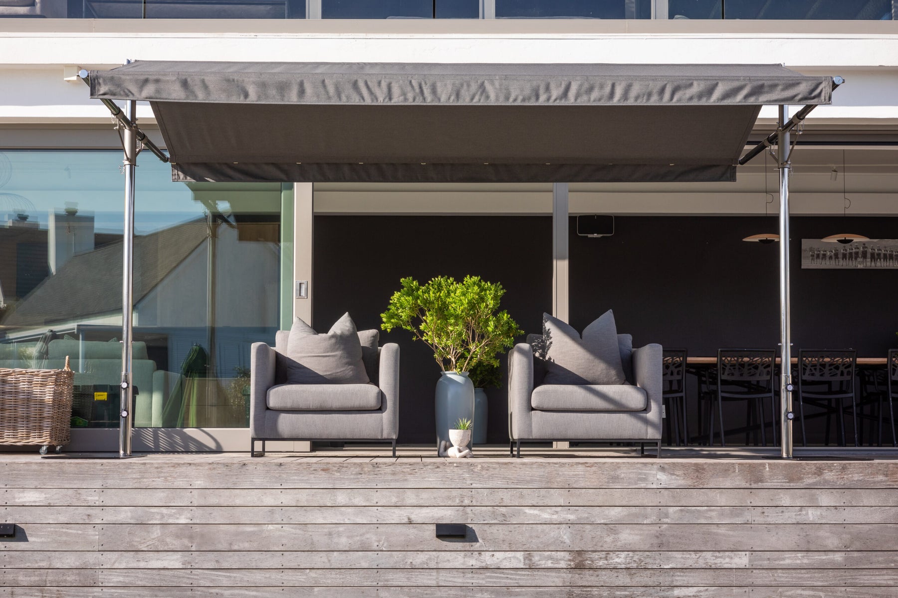 Connect two or more Papillon structures side-by-side using the built-in gutter to create one continuous awning—or place units end-to-end for extended linear shade.