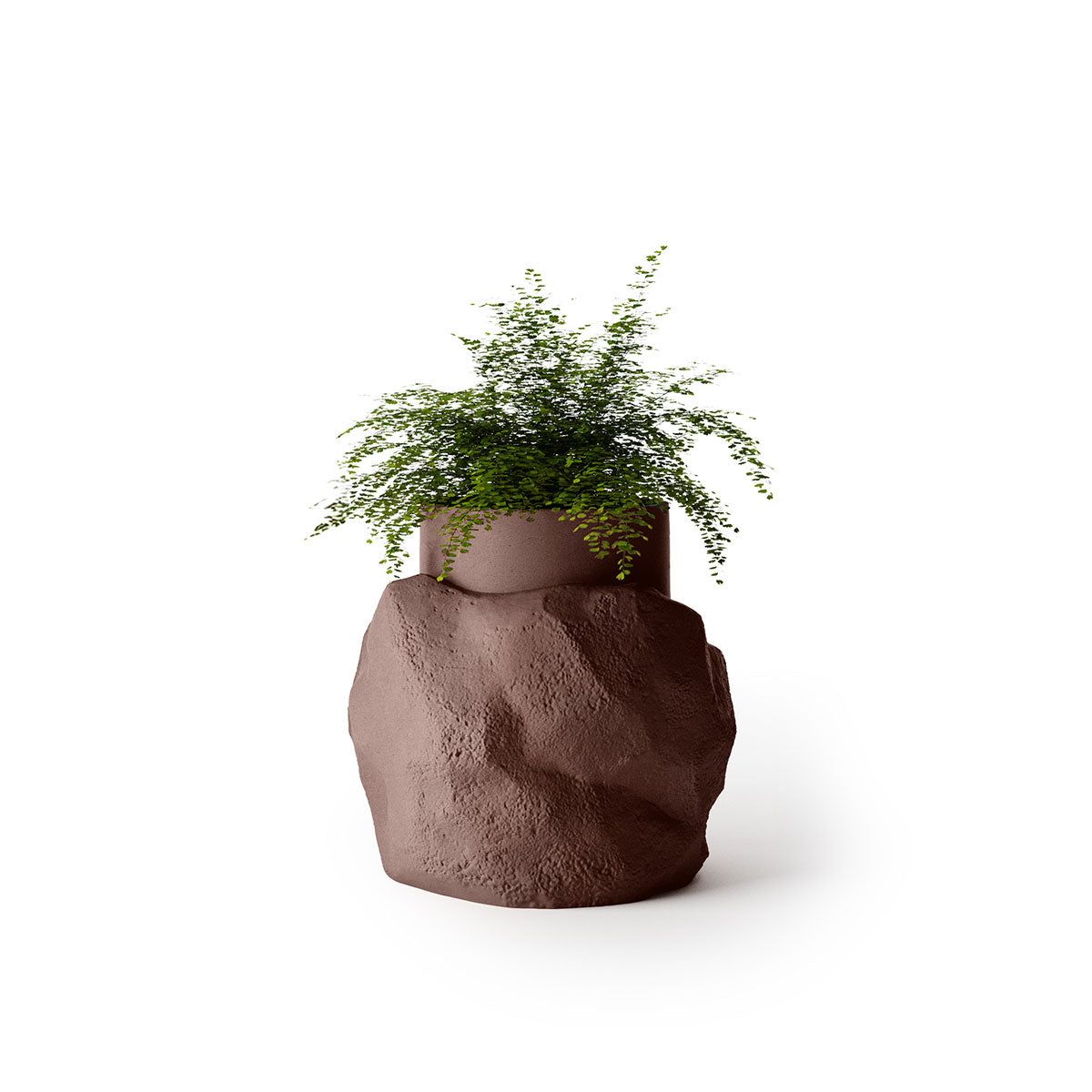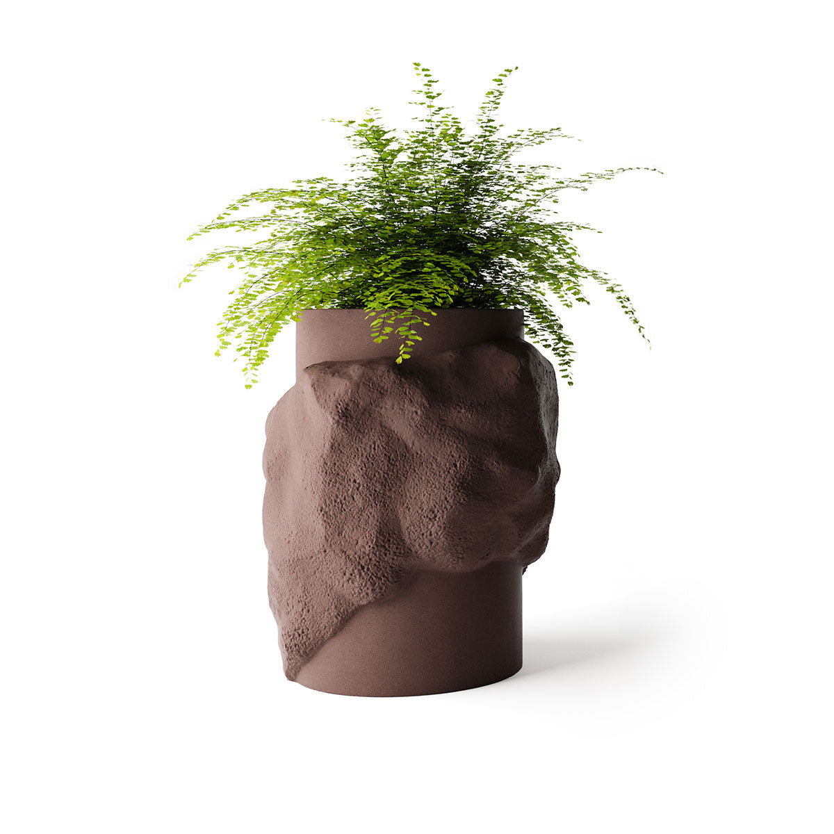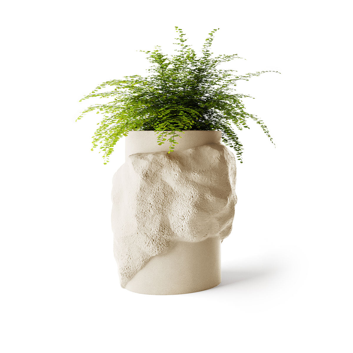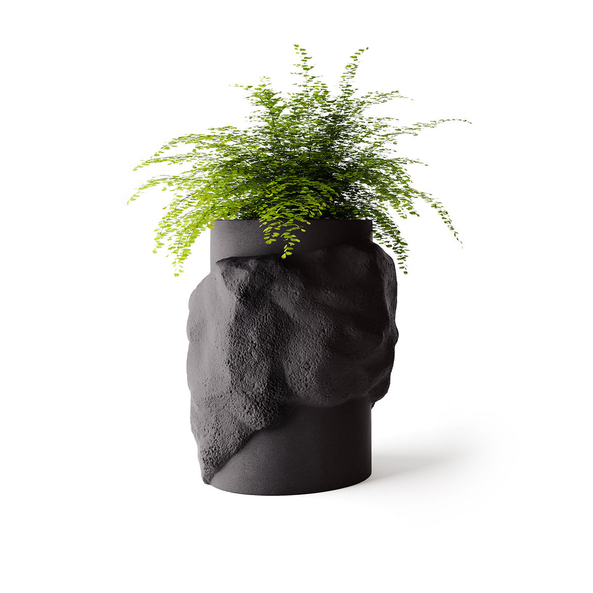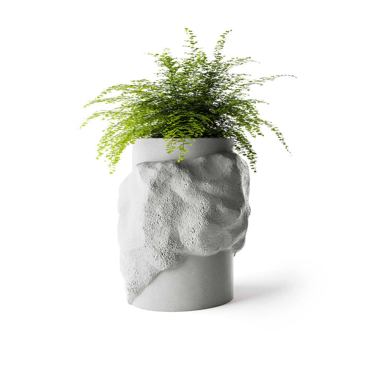 Petra’s cylindrical body provides a disciplined foundation, while its rock-like surface breaks the form with depth and irregularity. This contrast creates visual interest from every angle, allowing the planter to read as both sculpture and functional object.