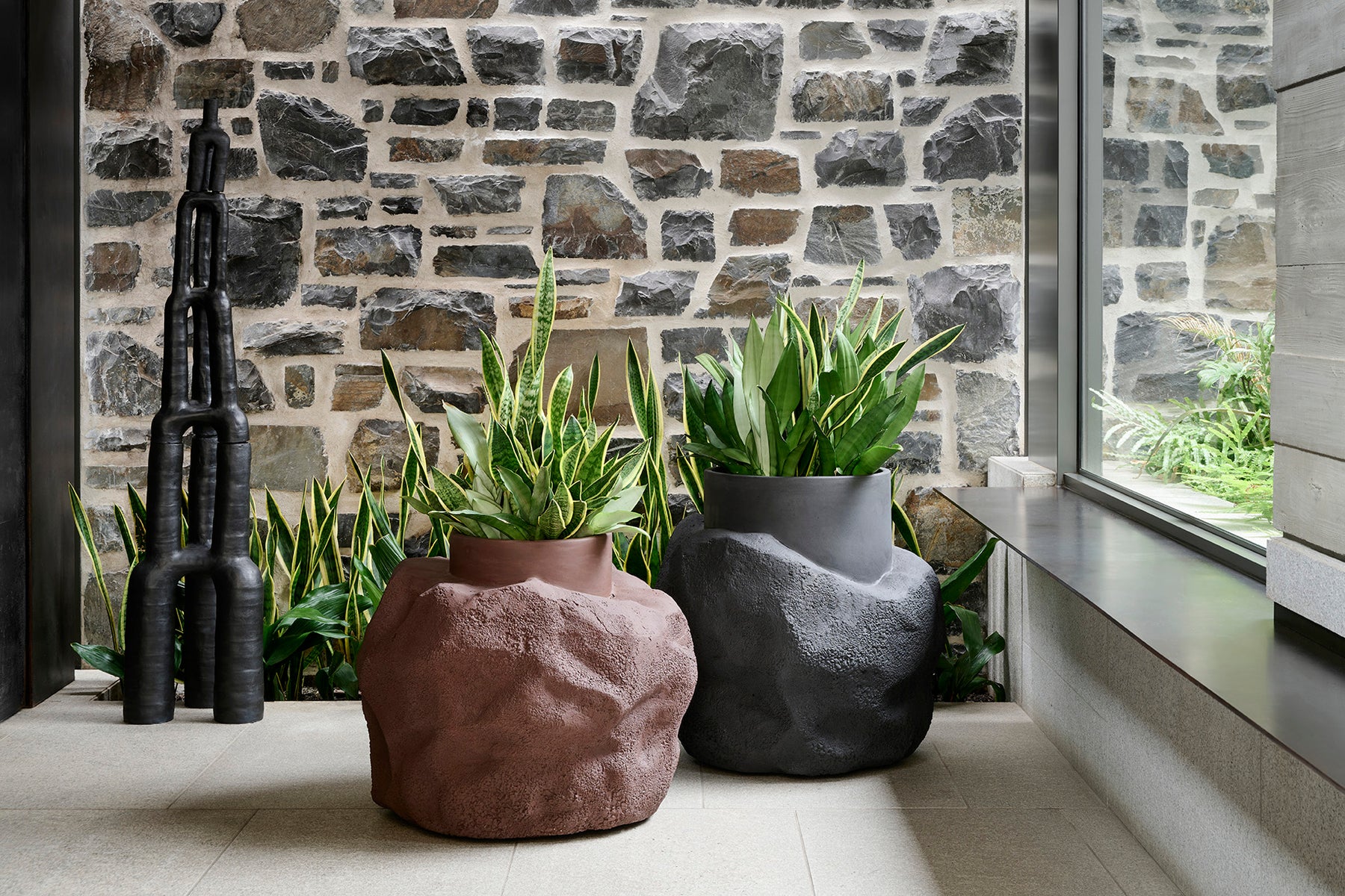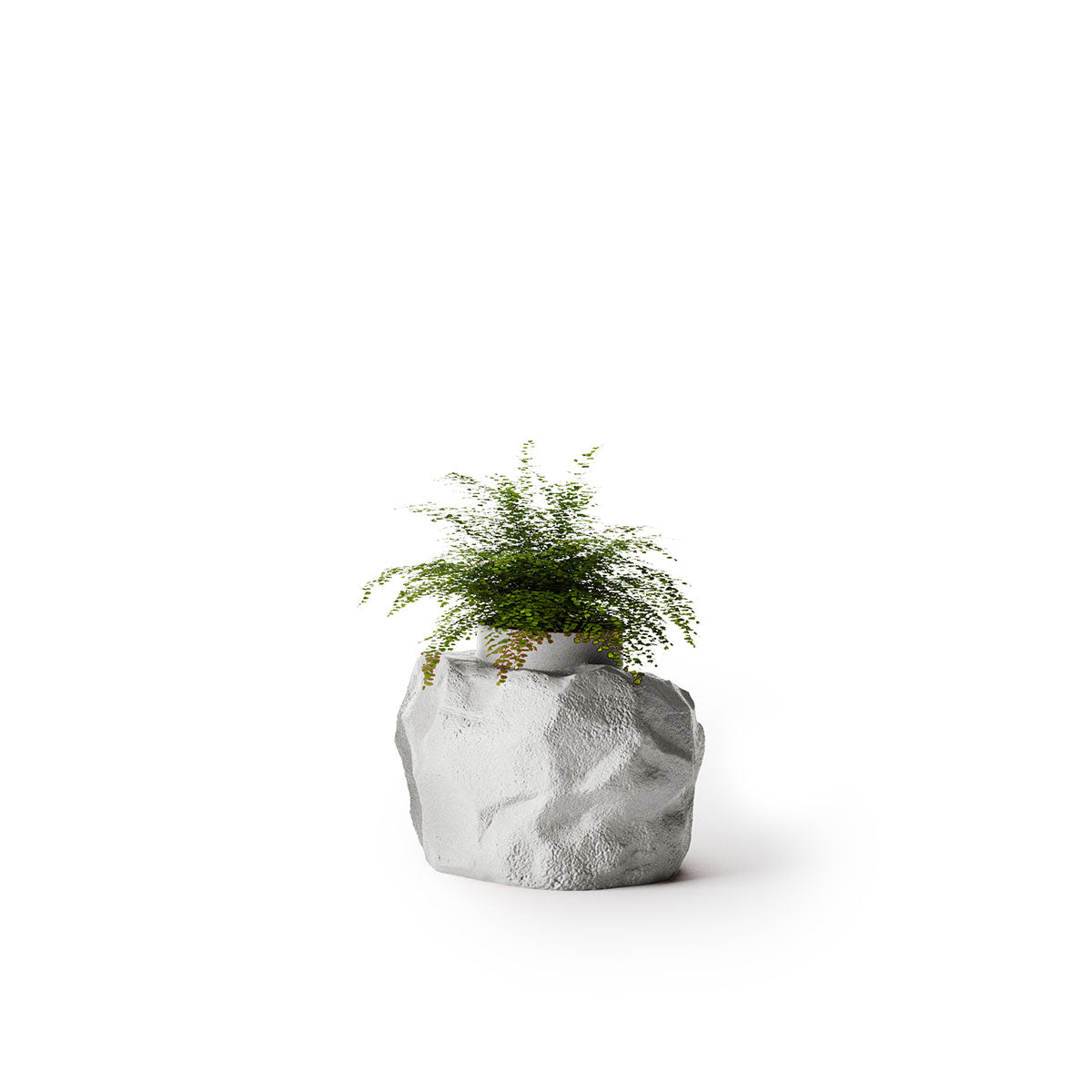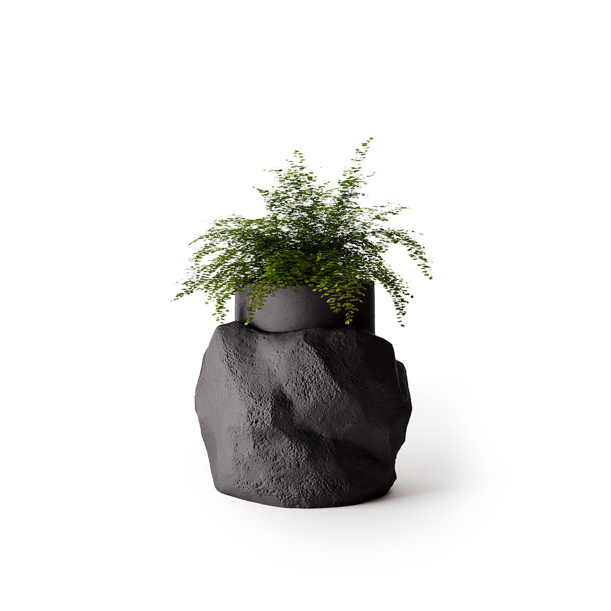 Sculptural stone planter that balances precise geometry with raw, rock-formed texture.