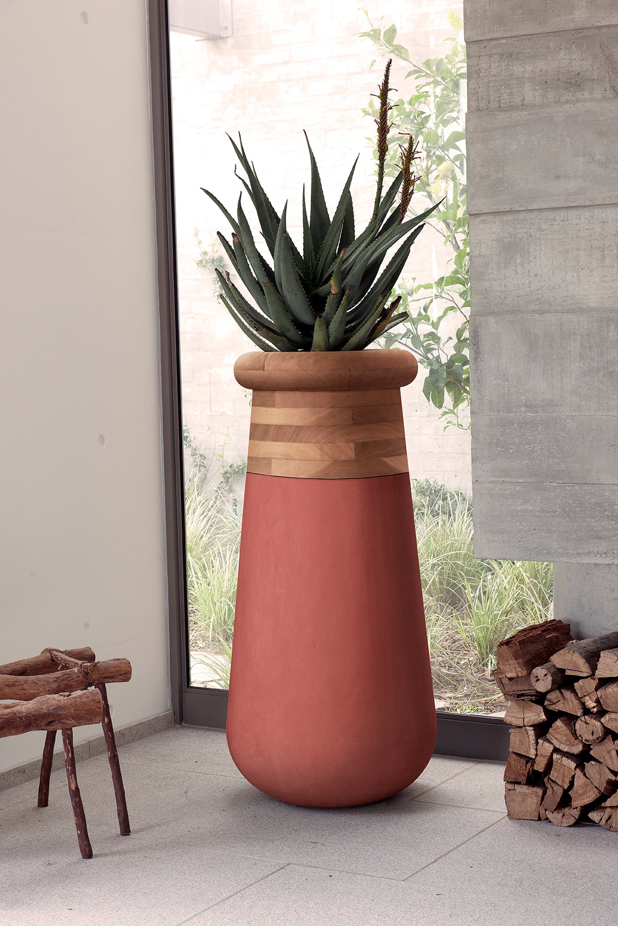 Vertical Sculptural Planter in Stone & Wood for Modern Spaces