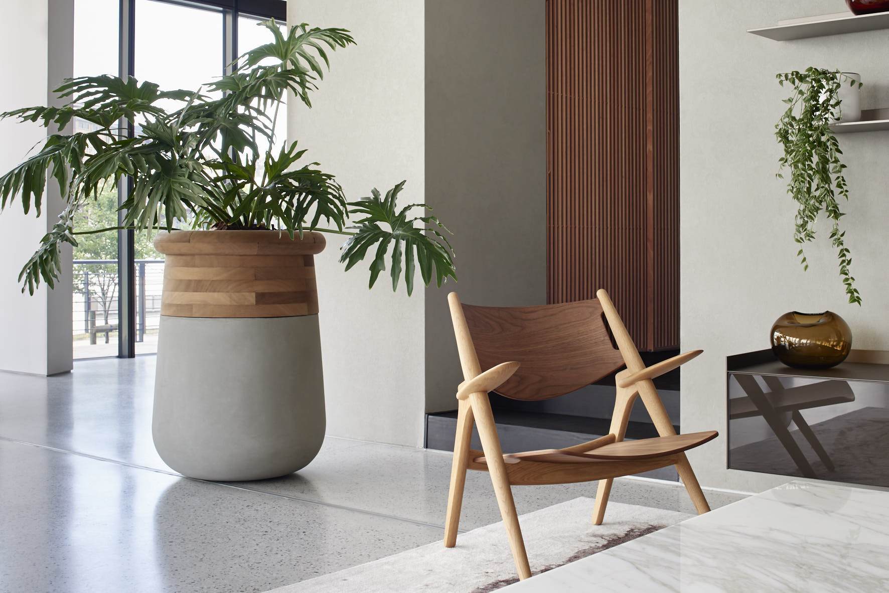 By raising planting higher than surrounding elements, Soma allows foliage to read clearly within a space. The vertical stance works especially well in layered interiors, corridors, terraces, and architectural settings where height and proportion matter.