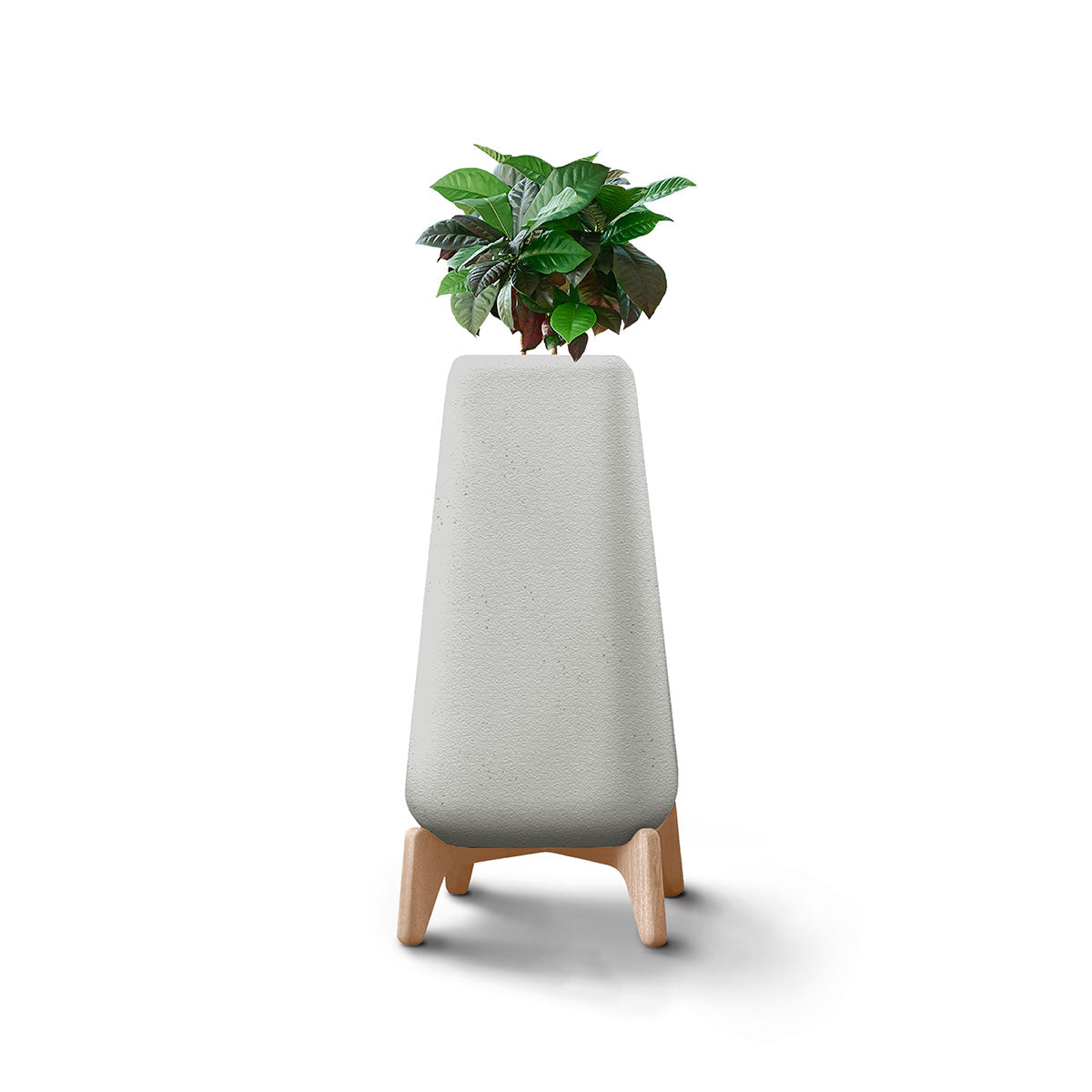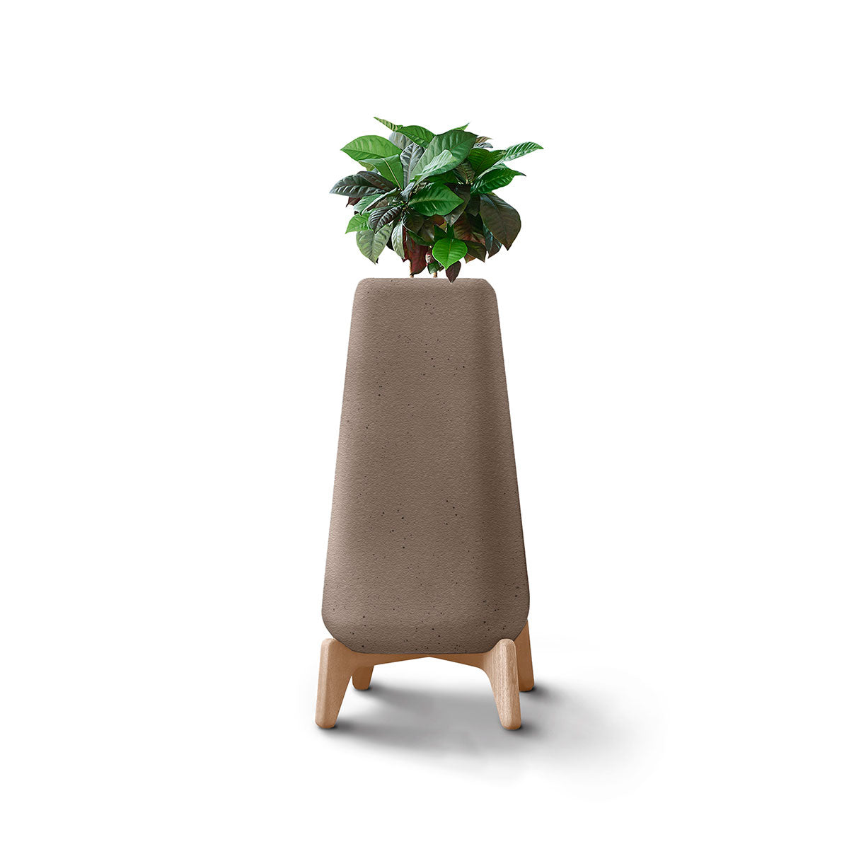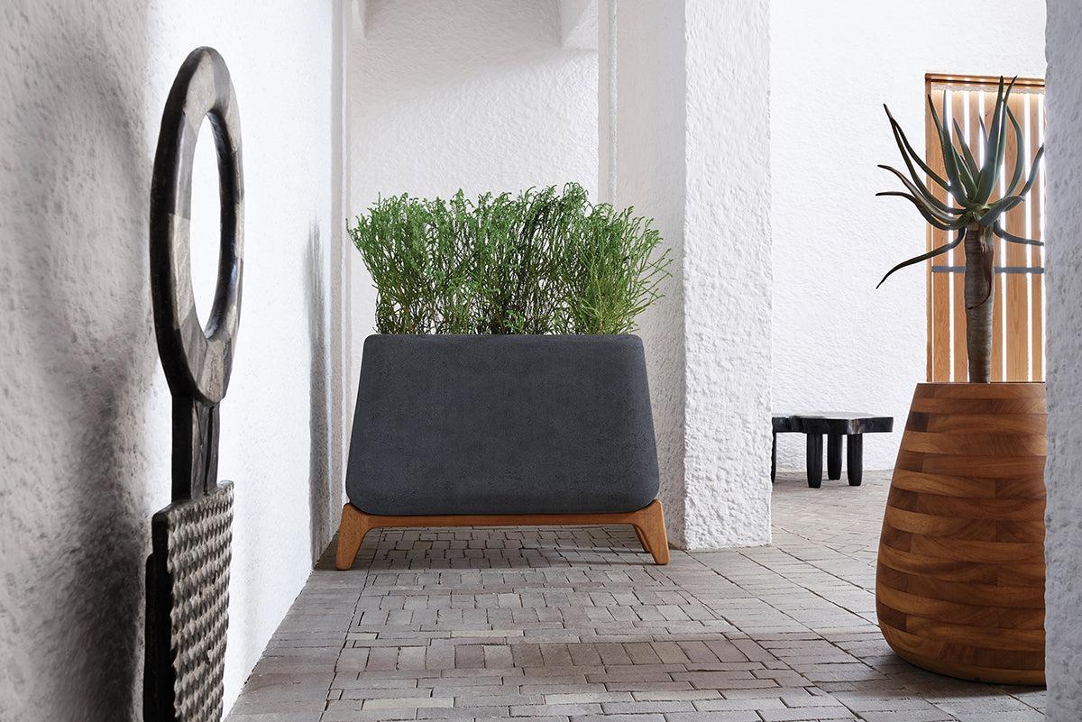 Pale grey concrete is paired with the natural tone of carved Iroko legs to create a dialogue between mineral and wood. This contrast enhances the planter’s presence while maintaining a calm, cohesive aesthetic.