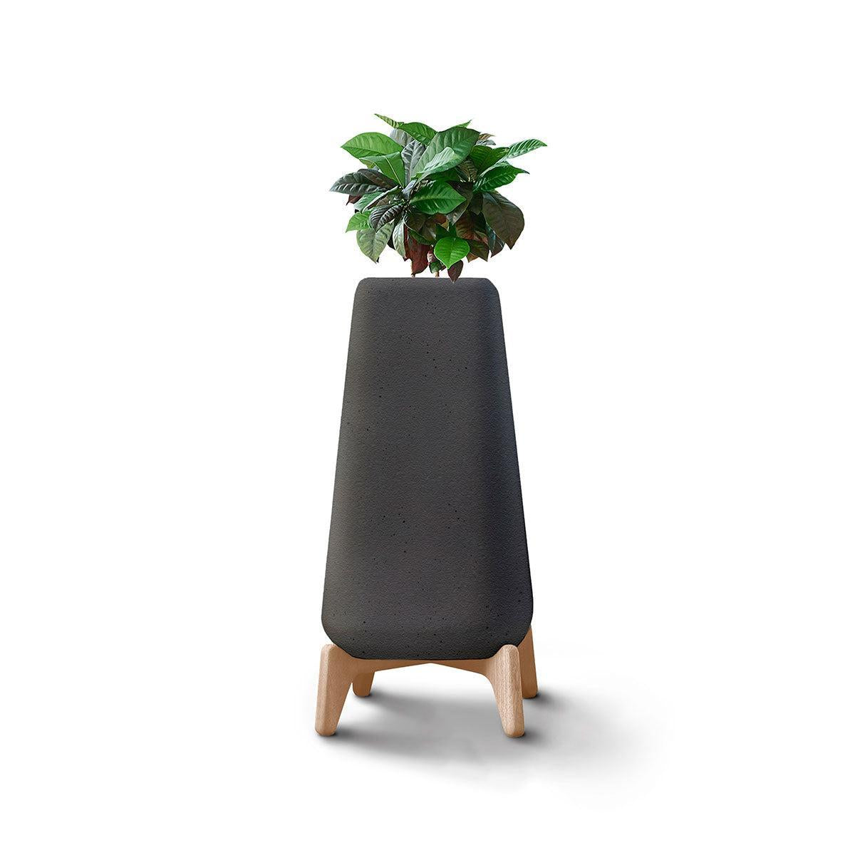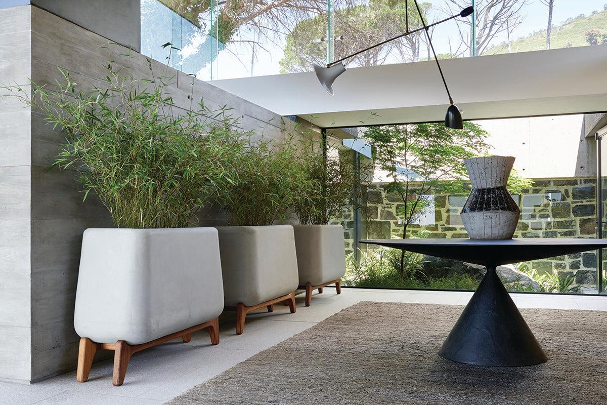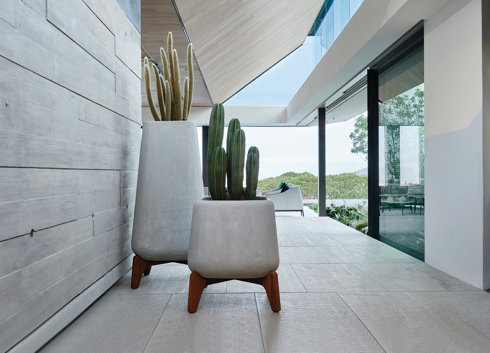 Pale grey concrete is paired with the natural tone of carved Iroko legs to create a dialogue between mineral and wood. This contrast enhances the planter’s presence while maintaining a calm, cohesive aesthetic.